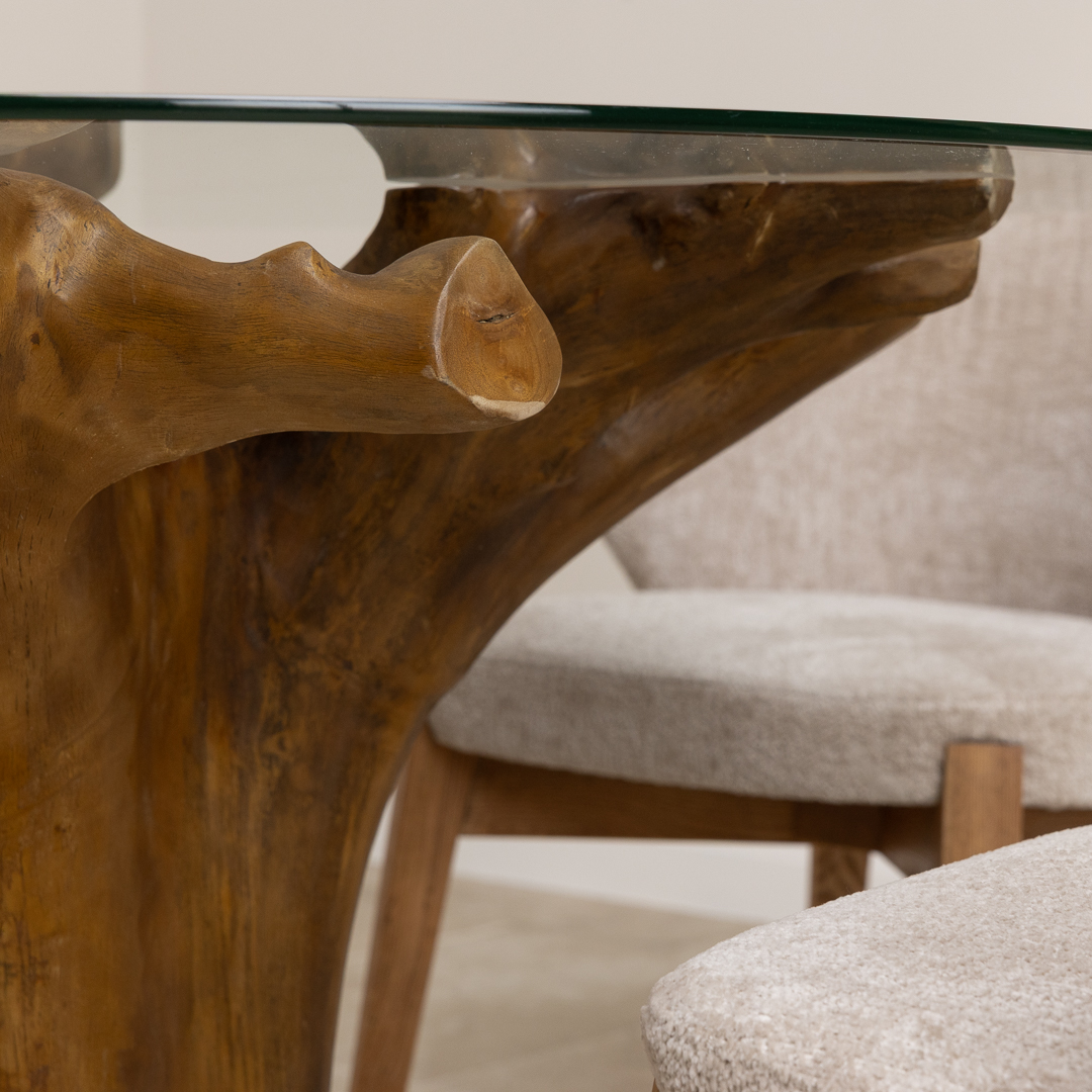150cm Circular Reclaimed Teak Root Piece Dining Table with 10mm Toughened Safety GlassIn stock