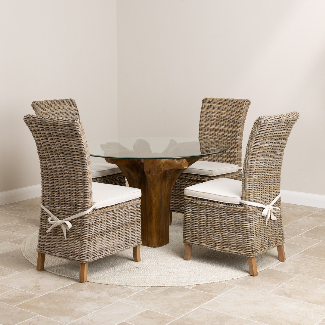 120cm Circular Reclaimed Teak Flute Root Indoor Dining Table with 4 Natural Kubu Wicker Chairs