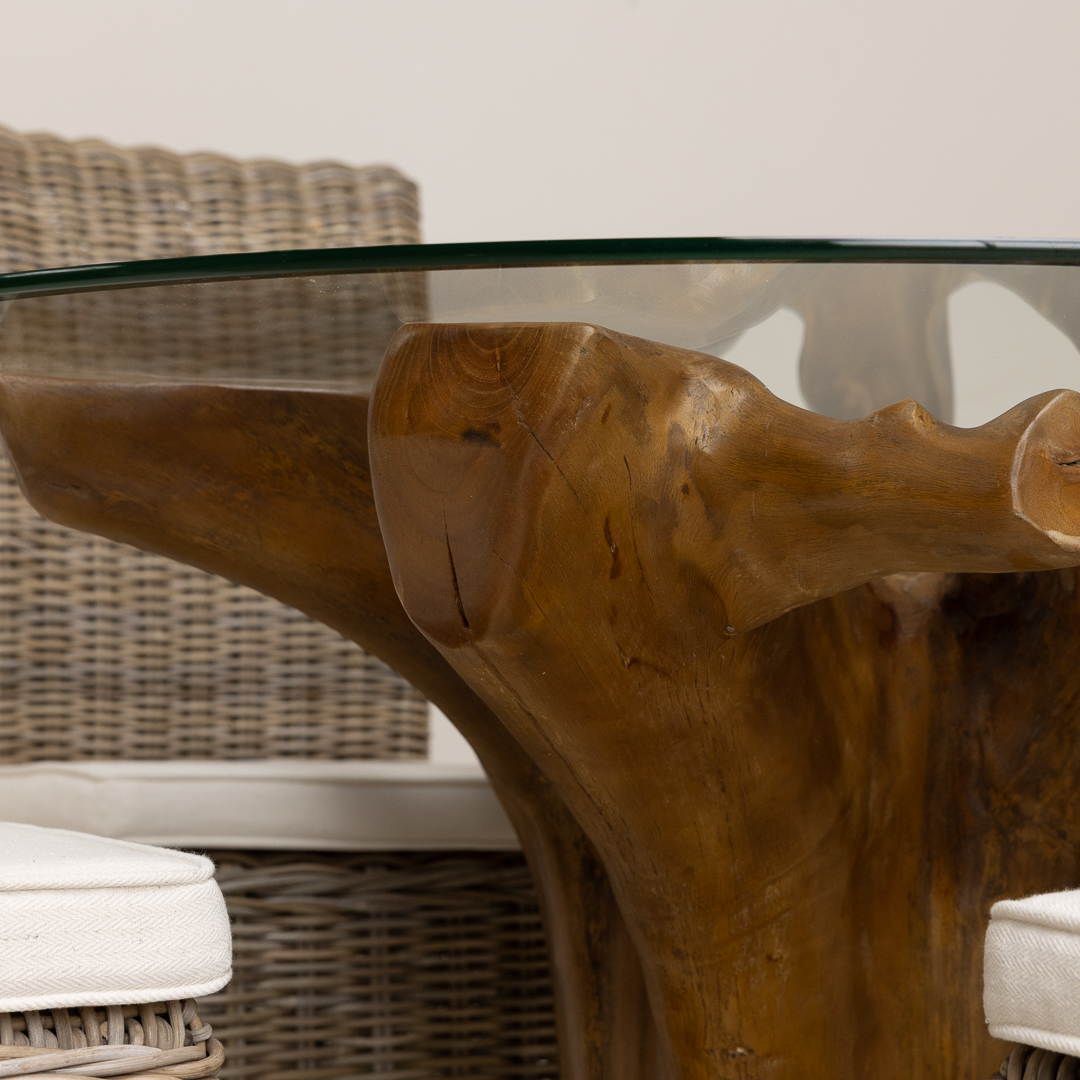 120cm Circular Reclaimed Teak Root Piece Dining Table with 10mm Toughened Safety GlassIn stock