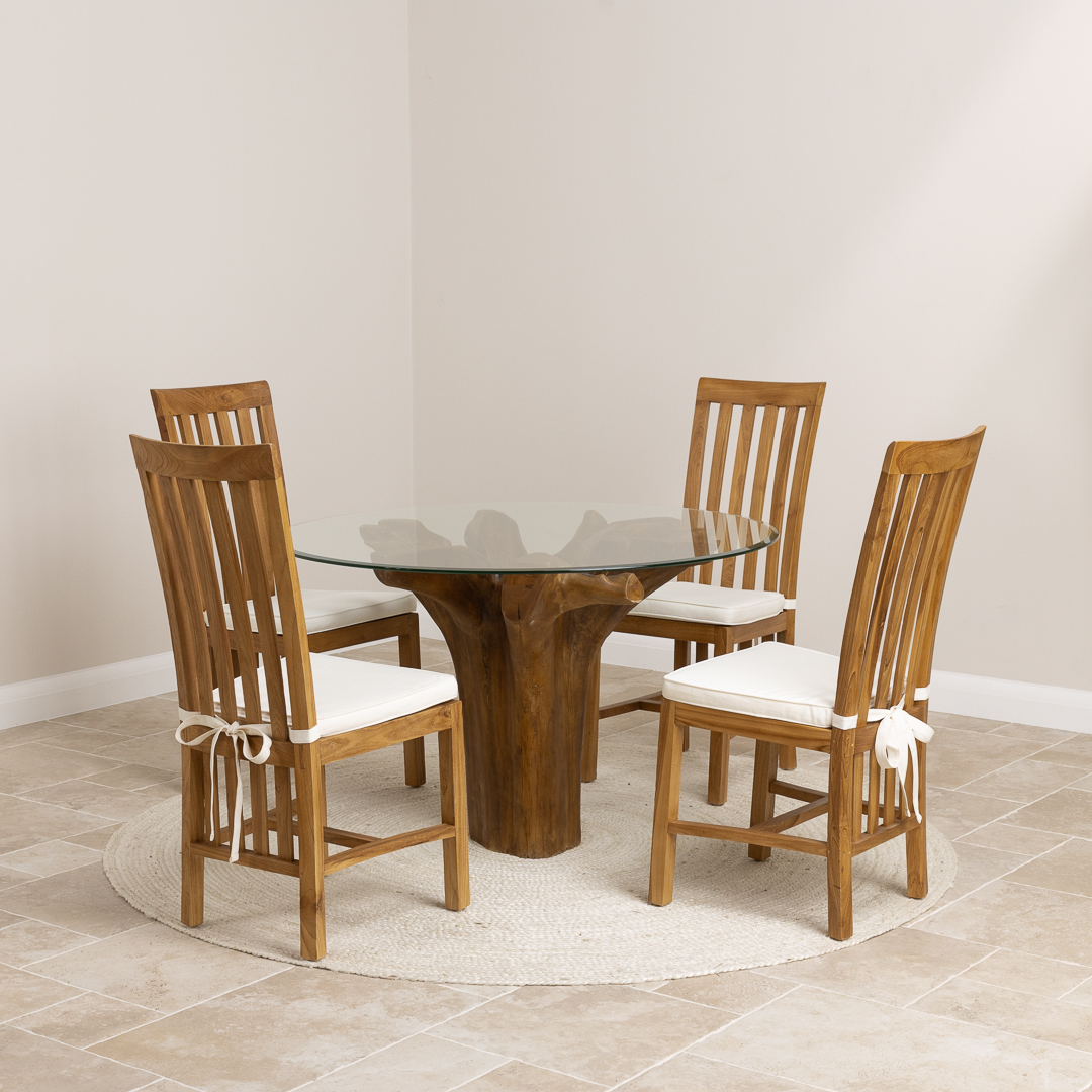 120cm Circular Teak Root Piece Dining Table with 4 Upholstered Cove ChairsIn stock