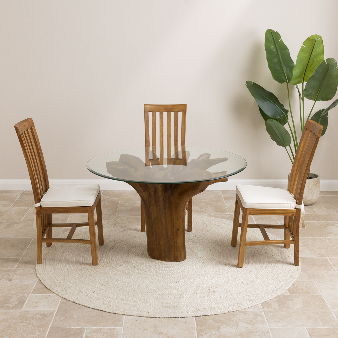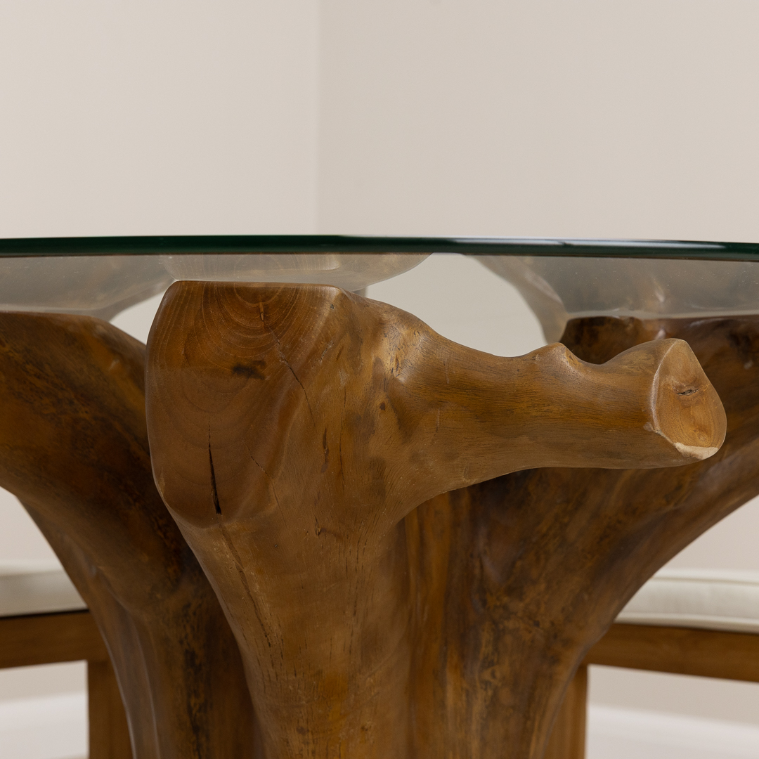 120cm Circular Reclaimed Teak Root Piece Dining Table with 10mm Toughened Safety GlassIn stock