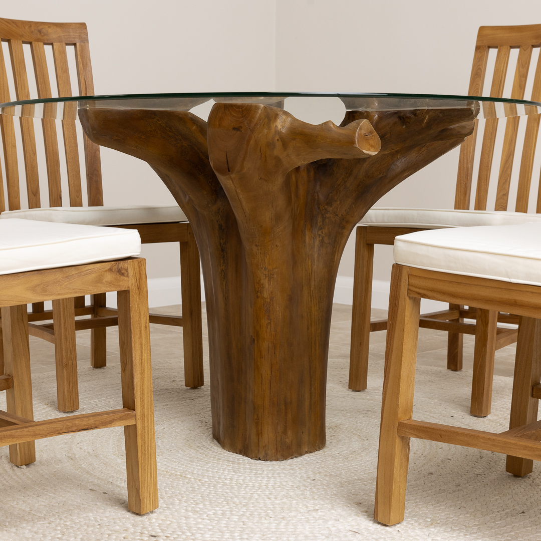 150cm Circular Reclaimed Teak Root Piece Dining Table with 10mm Toughened Safety GlassIn stock