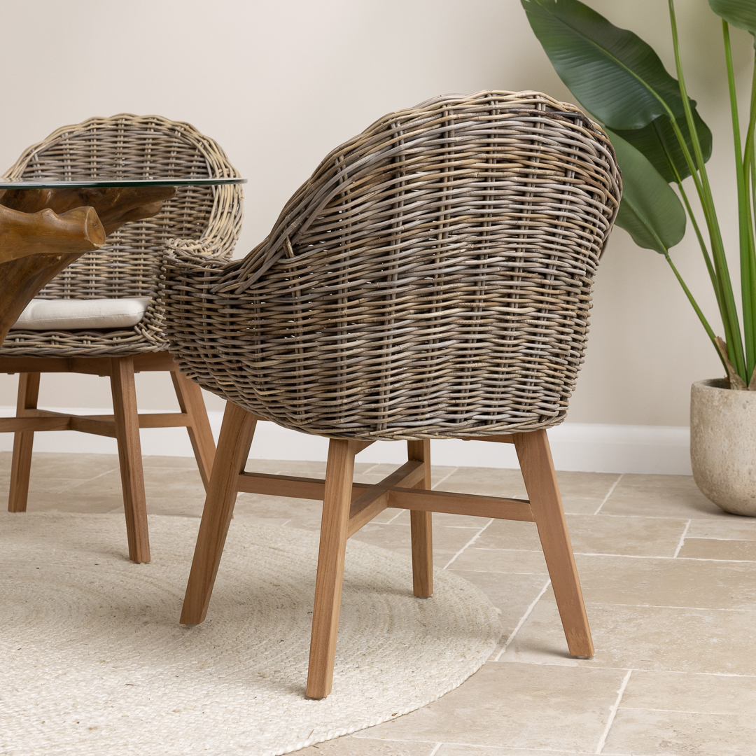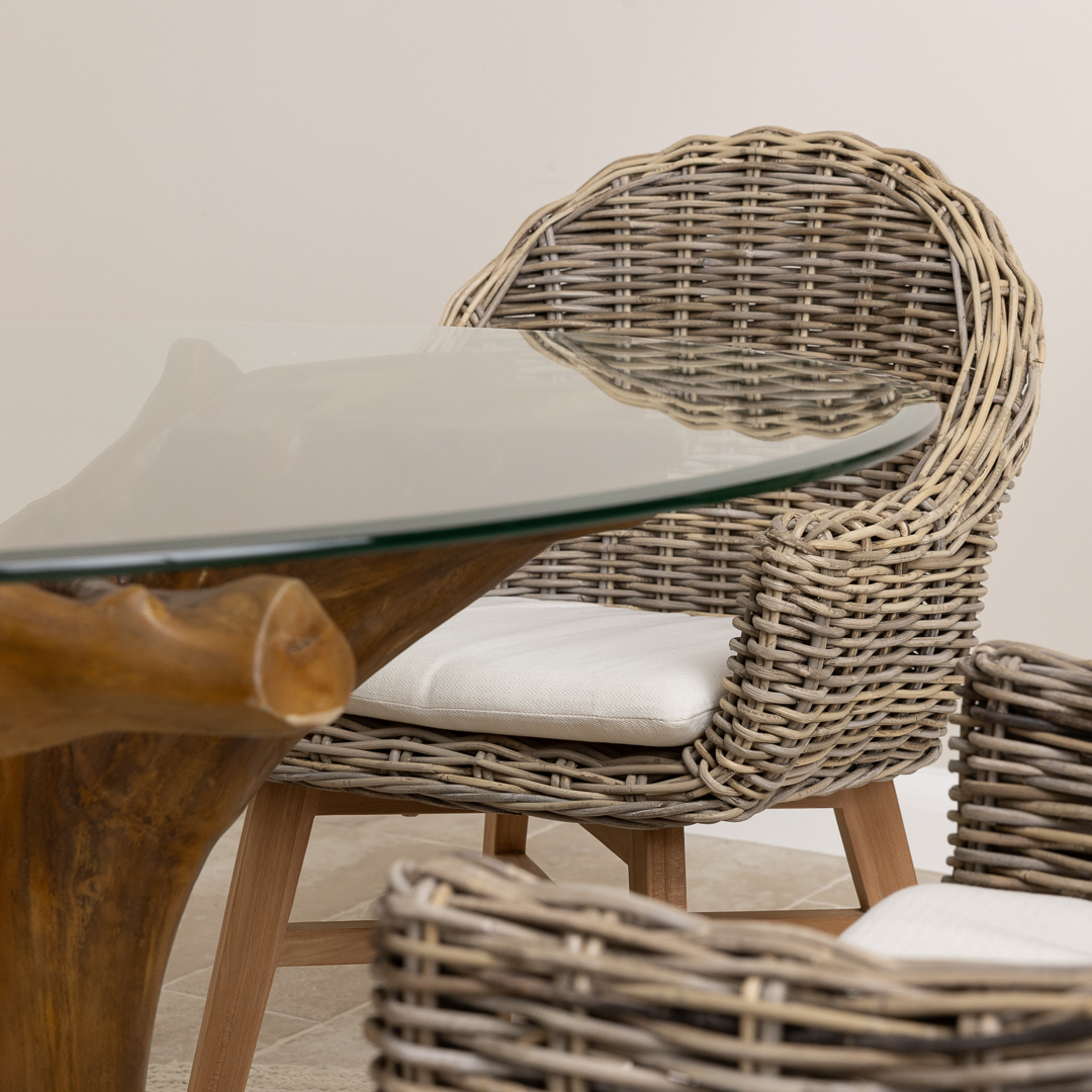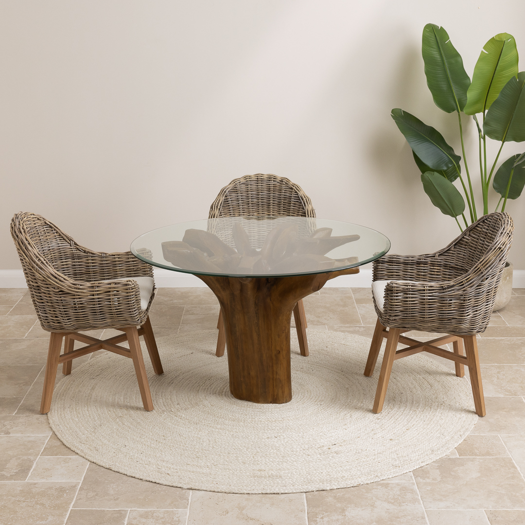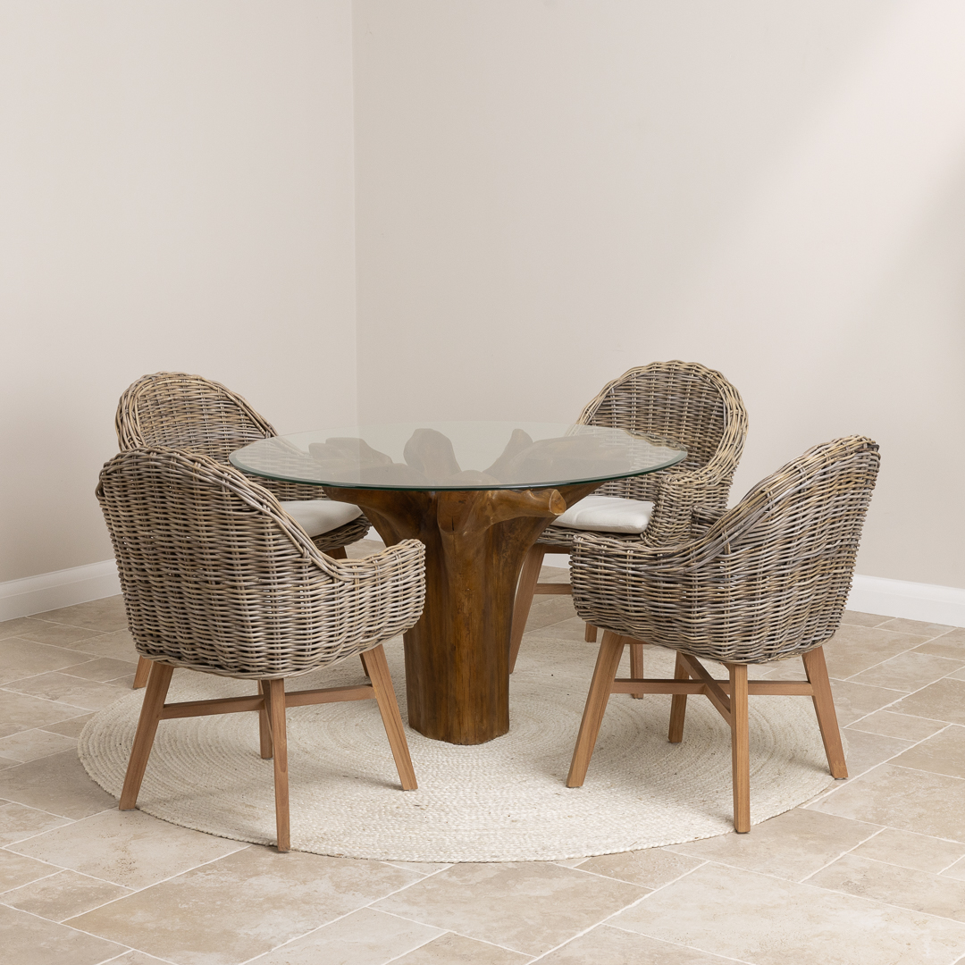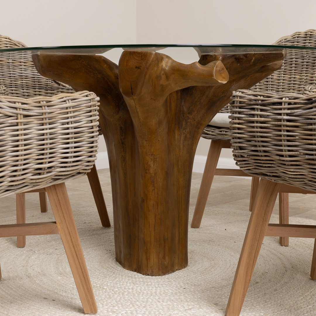 120cm Circular Teak Root Piece Dining Table with 4 Natural Kubu Wicker ChairsIn stock