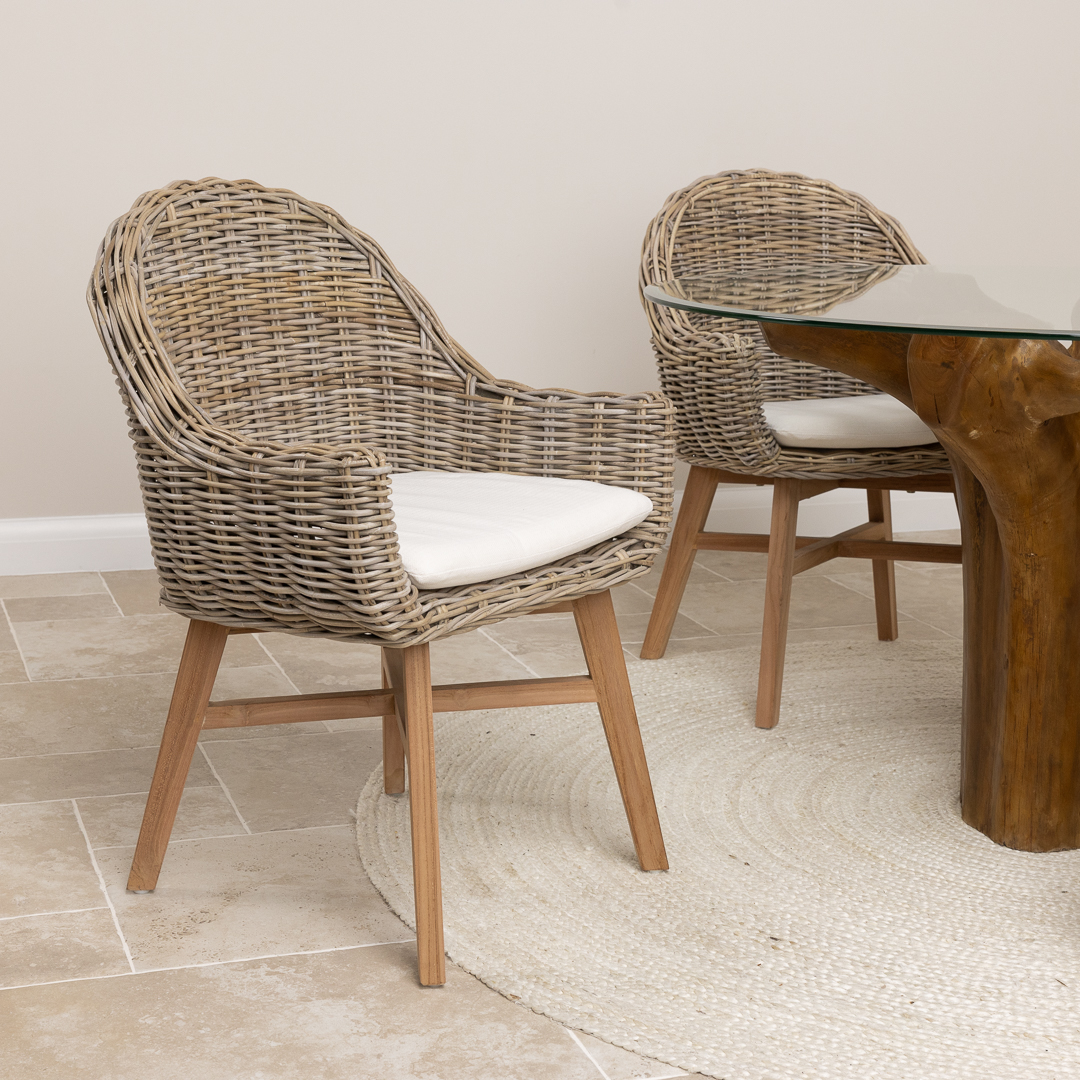 180cm x 120cm Rectangular Reclaimed Teak Root Indoor Dining Table with 4 or 6 Natural Kubu Wicker ChairsIn stock