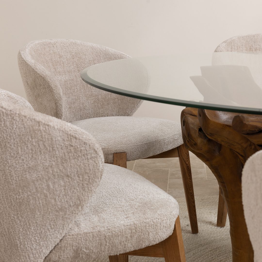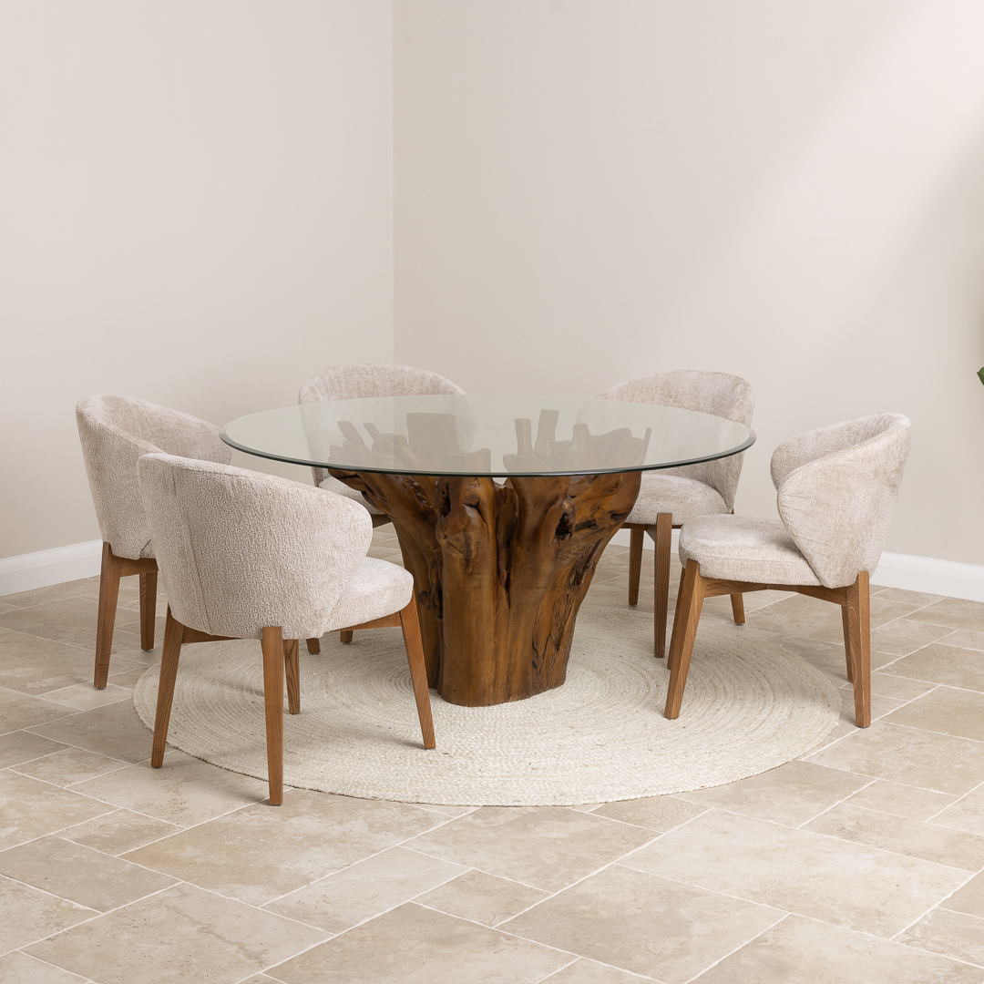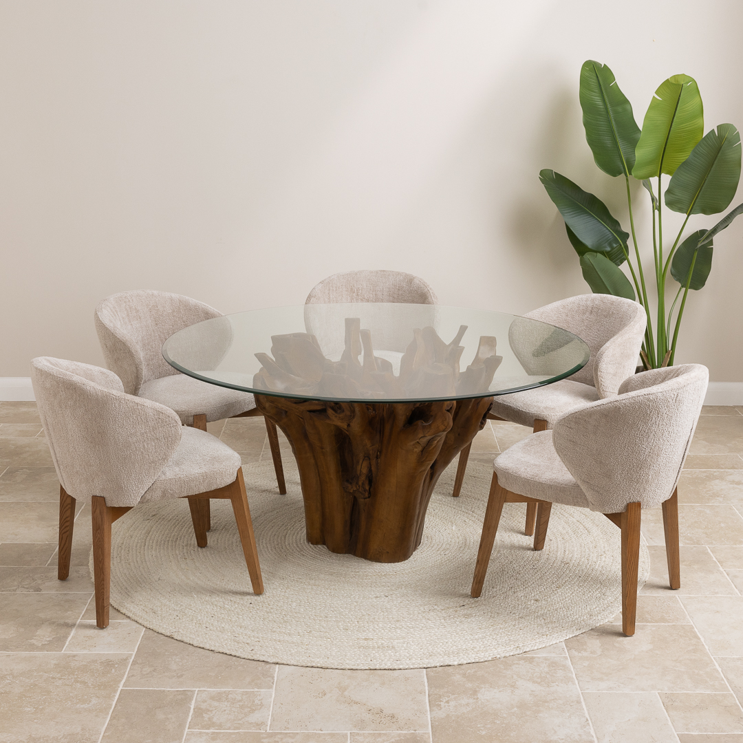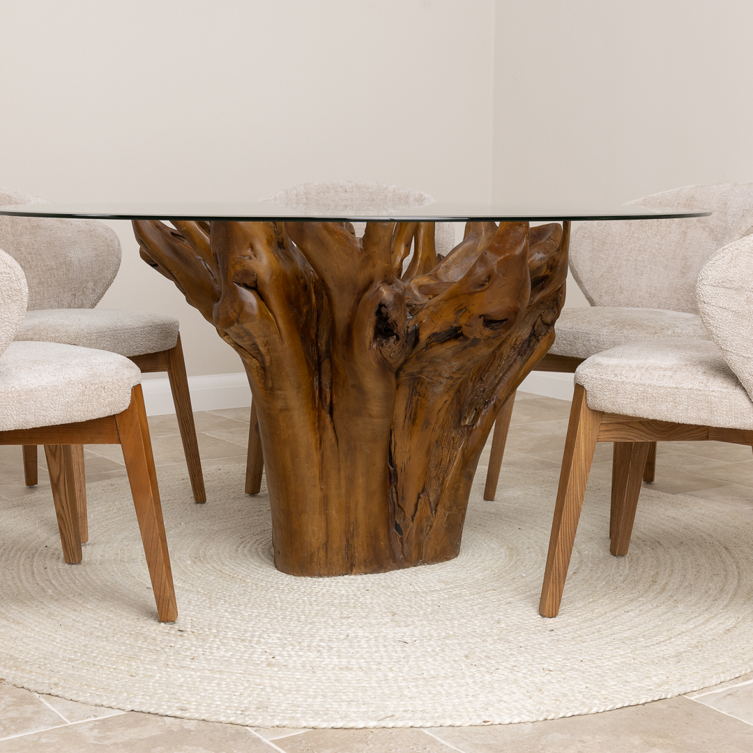 150cm Circular Teak Root Piece Dining Table with 6 Upholstered Cove ChairsIn stock