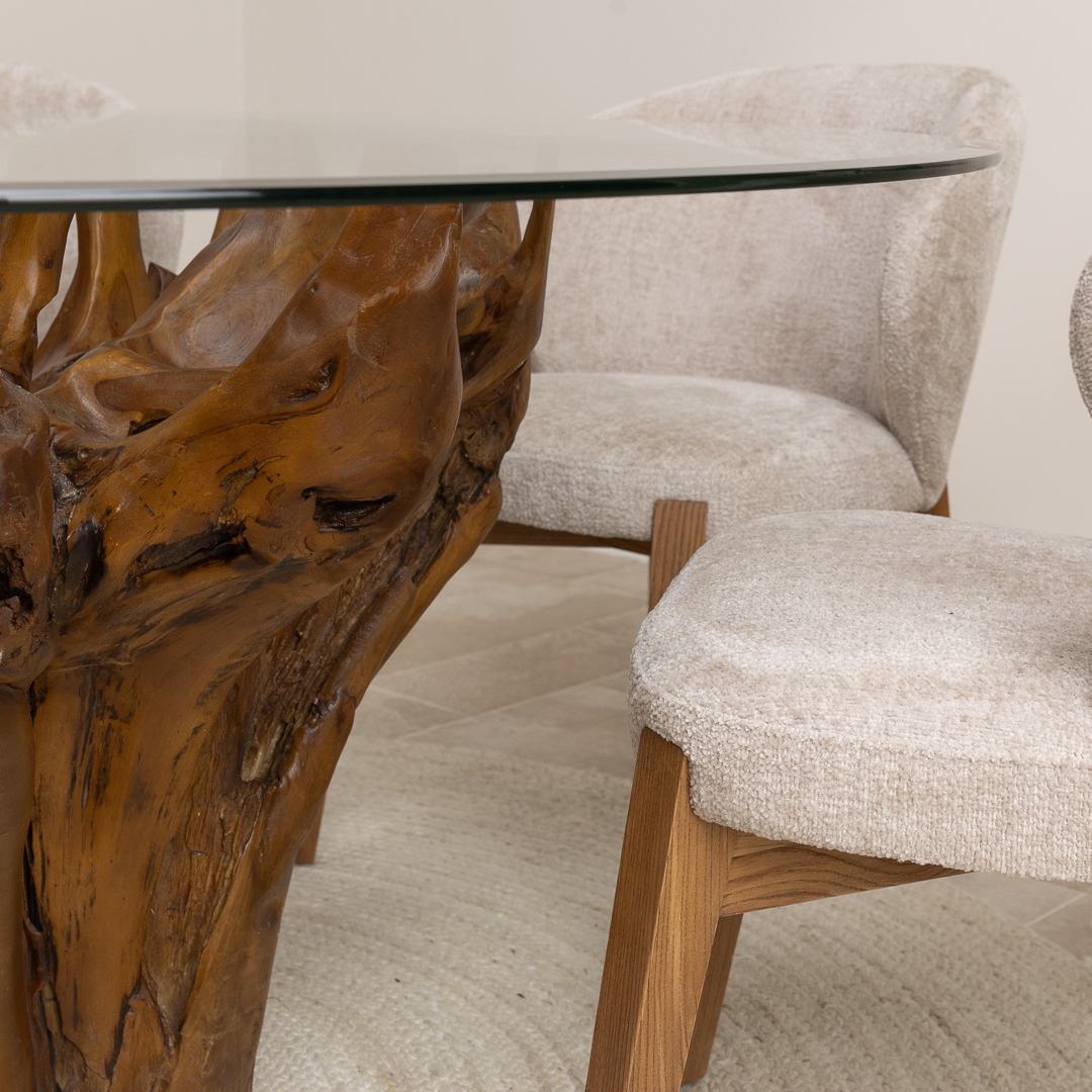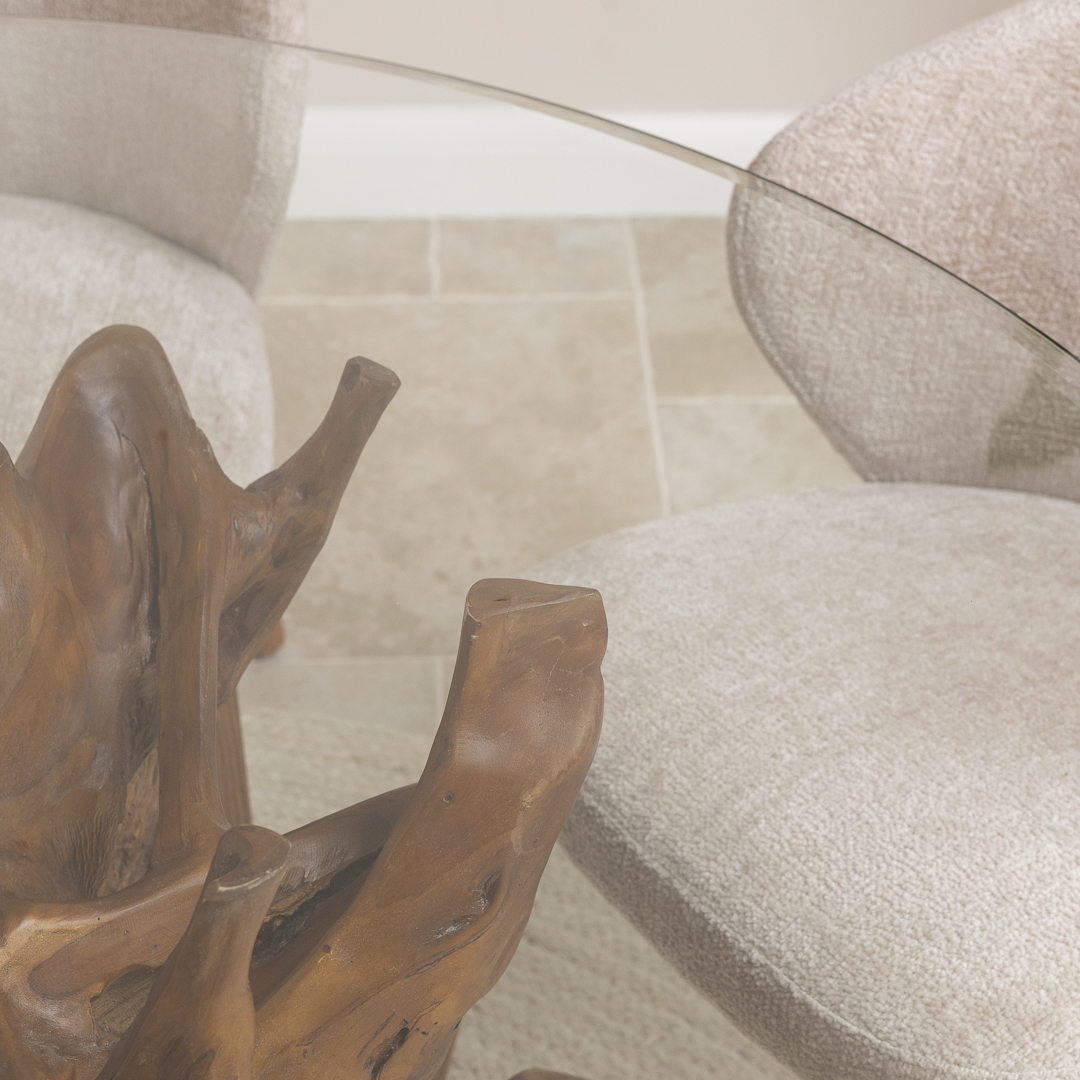 120cm Circular Teak Root Piece Dining Table with 4 Upholstered Cove ChairsIn stock