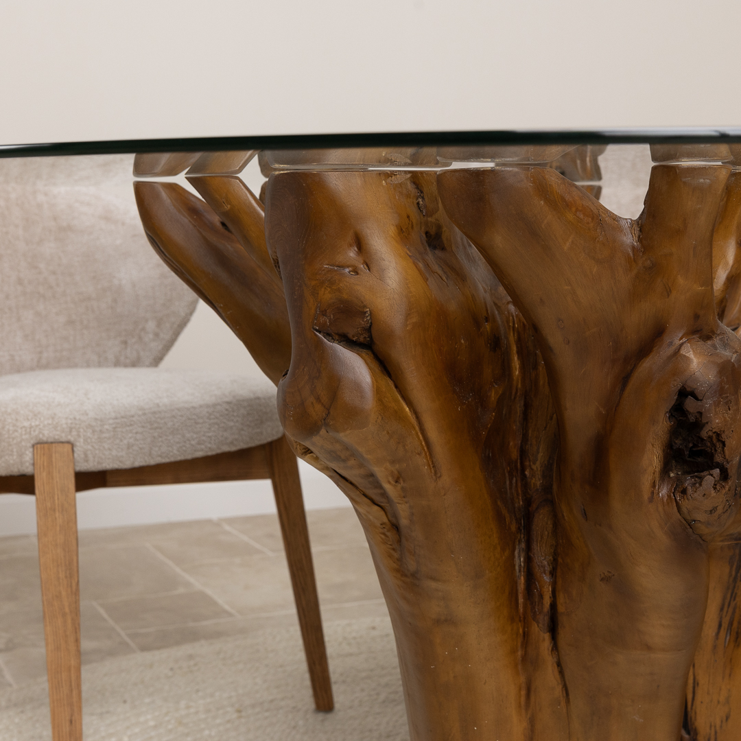 150cm Circular Reclaimed Teak Root Piece Dining Table with 10mm Toughened Safety GlassIn stock