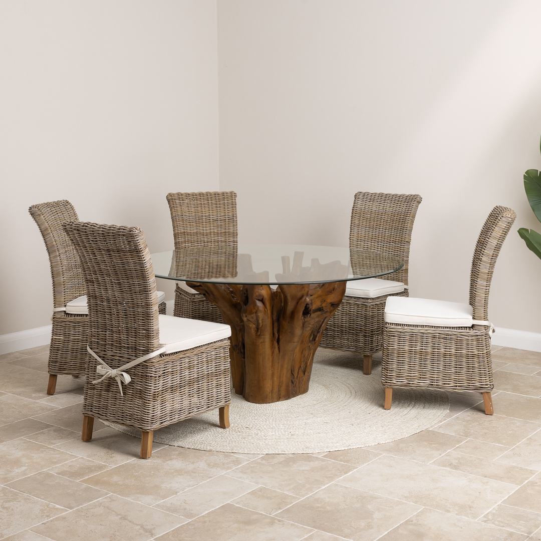 120cm Circular Teak Root Piece Dining Table with 4 Natural Kubu Wicker ChairsIn stock