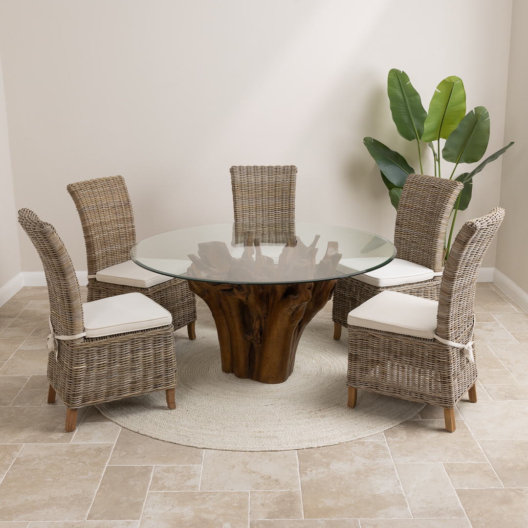 150cm Circular Reclaimed Teak Flute Root Indoor Dining Table with 4 Natural Kubu Wicker ChairsIn stock