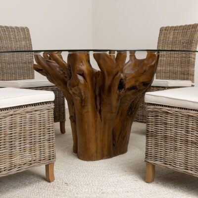 120cm Circular Teak Root Piece Dining Table with 4 Natural Kubu Wicker ChairsIn stock