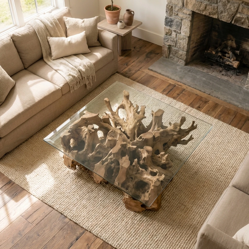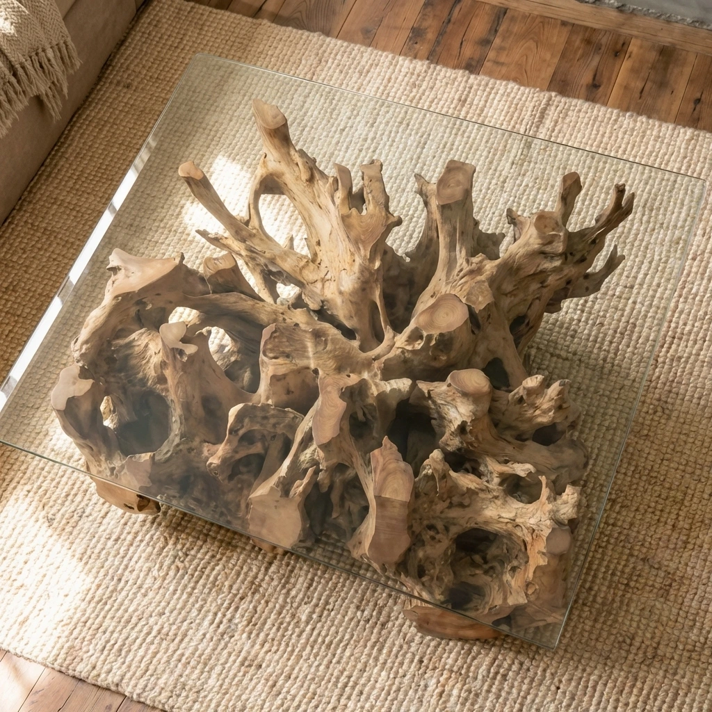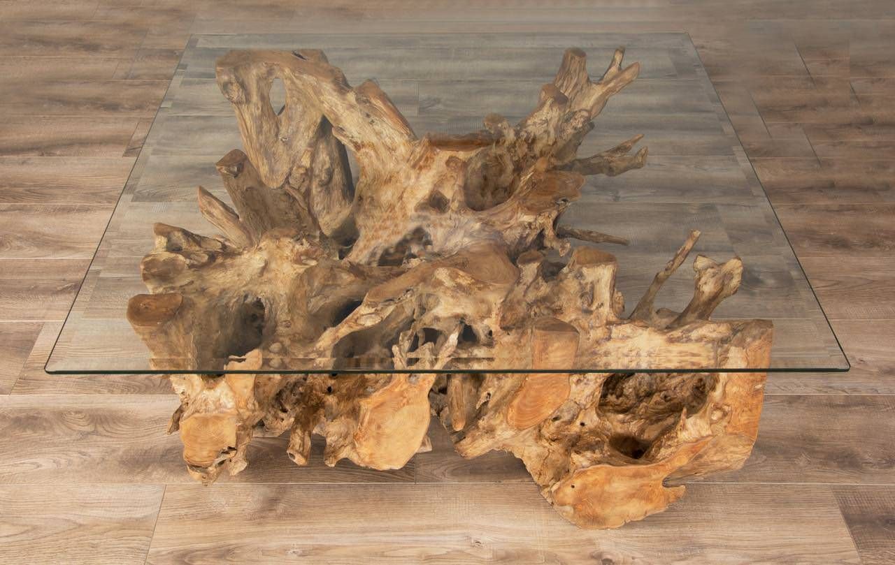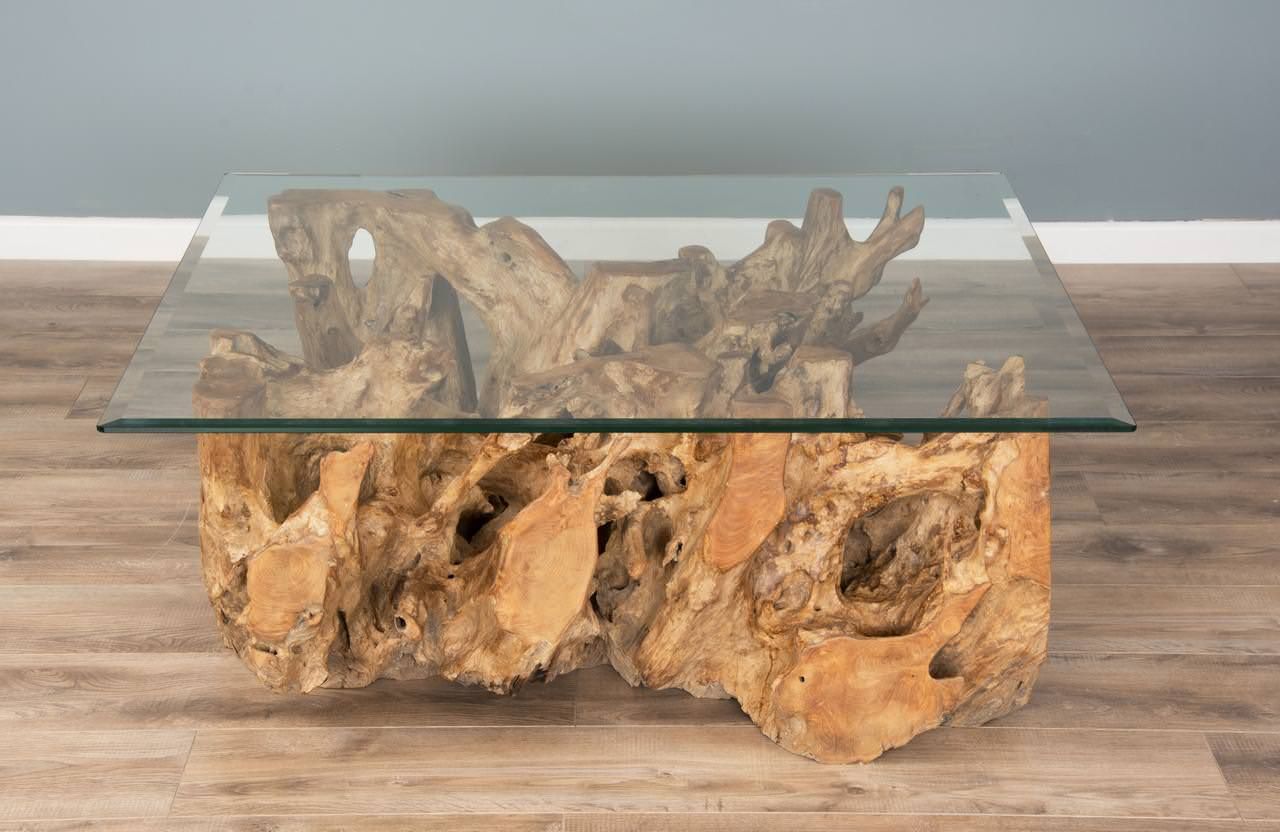 120cm Square Reclaimed Teak Root Cross Sectional Coffee Table with 10mm Toughened Safety Glass
