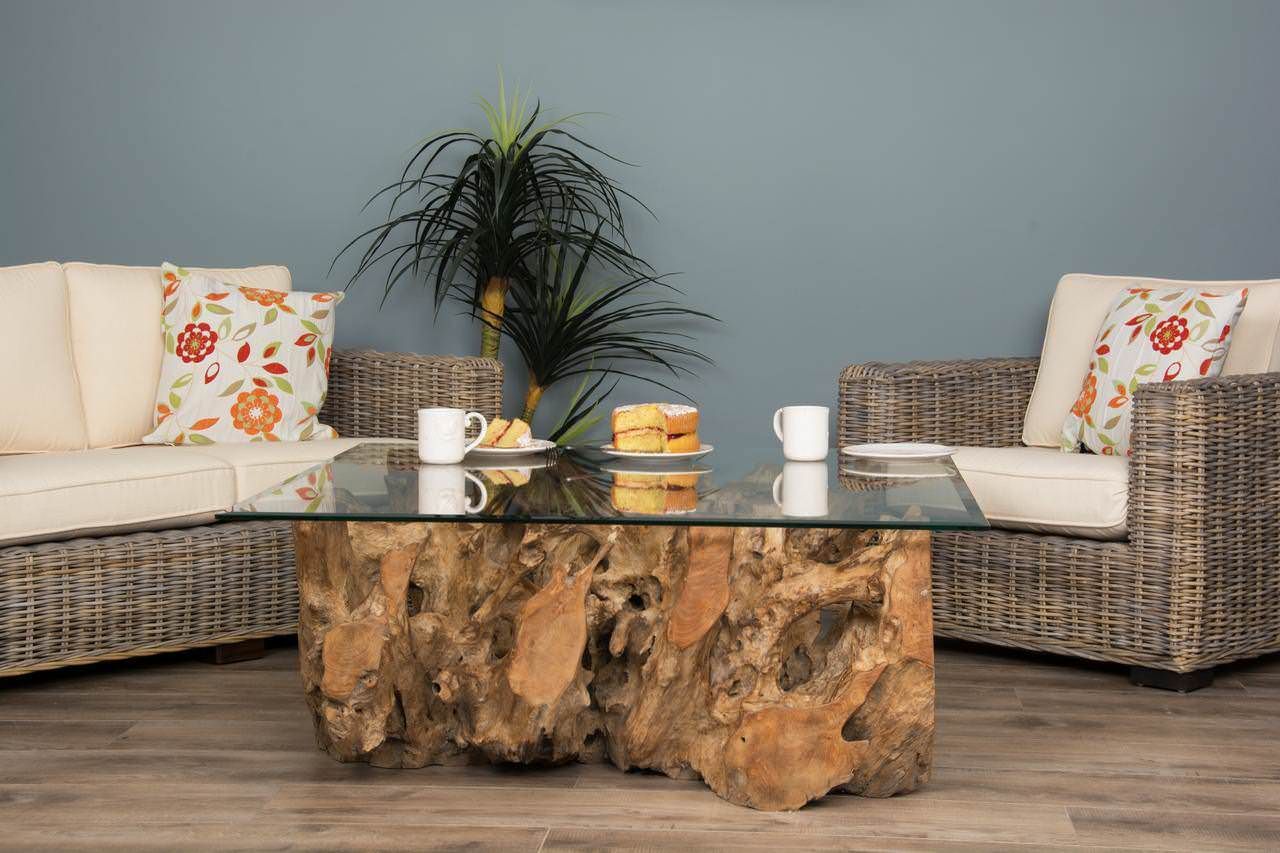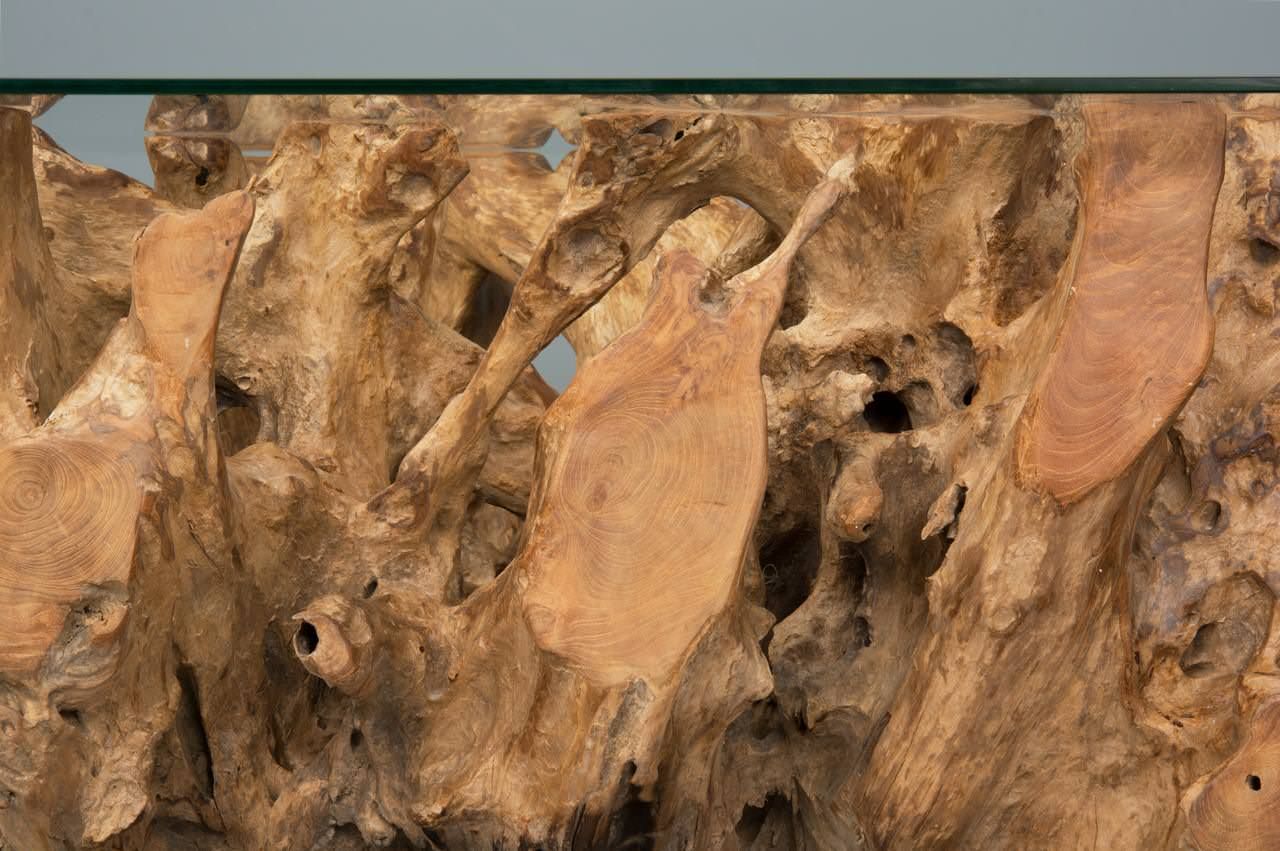 120cm x 80cm Rectangular Reclaimed Teak Root Cross Sectional Coffee Table with 10mm Toughened Safety GlassIn stock