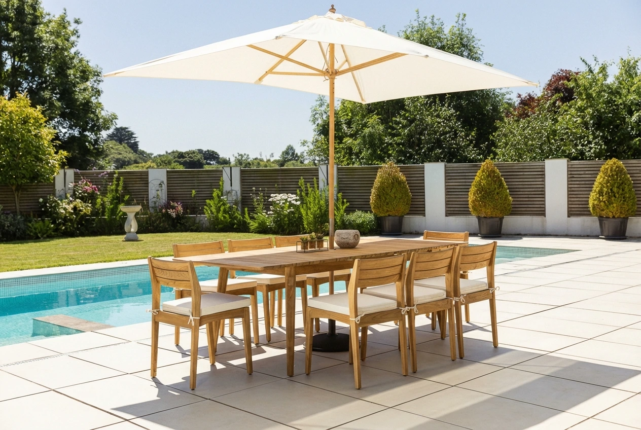 180cm - 240cm Certified Teak Single Extending Cross Leg Outdoor Dining Table with 6 or 8 Marley Teak Stacking ChairsIn stock