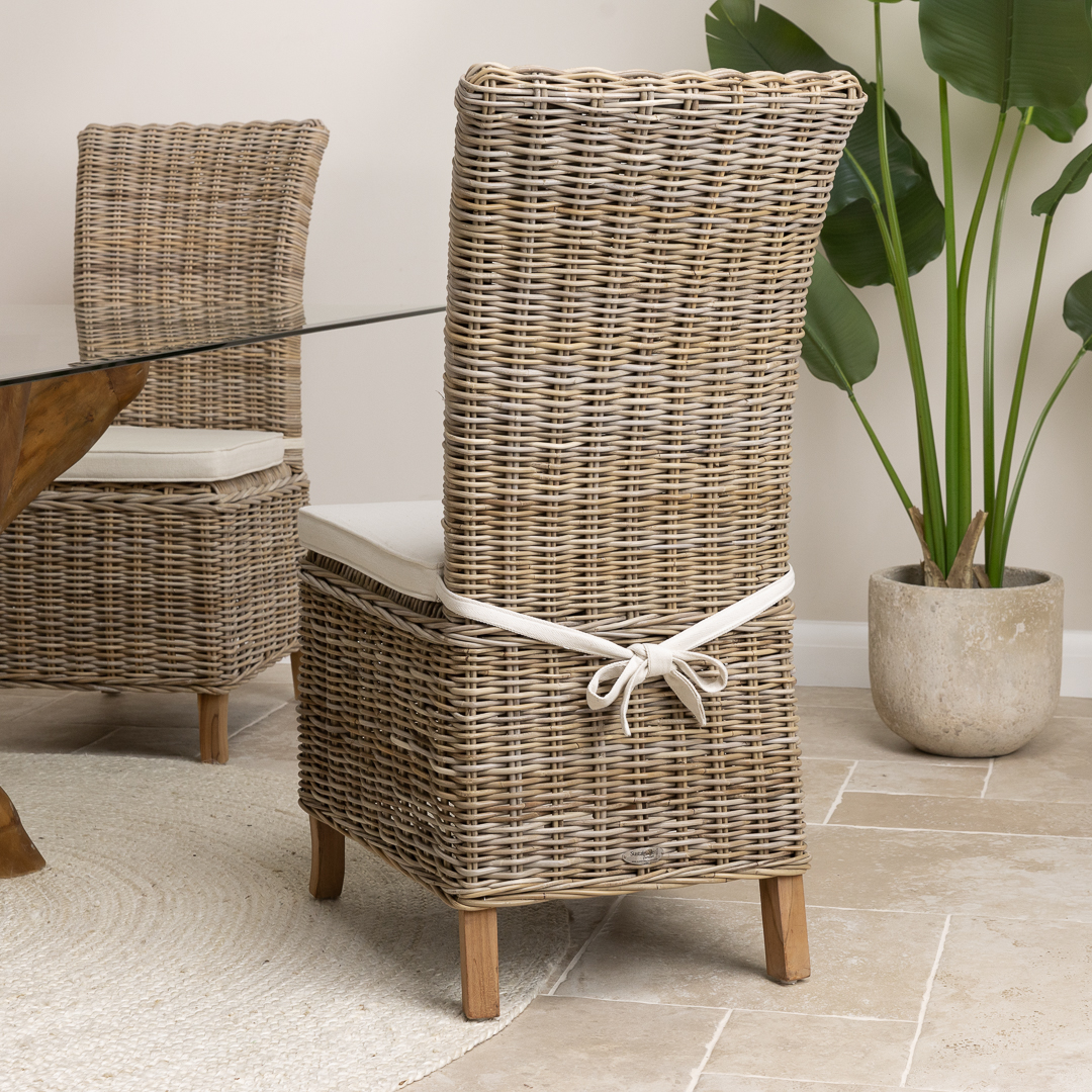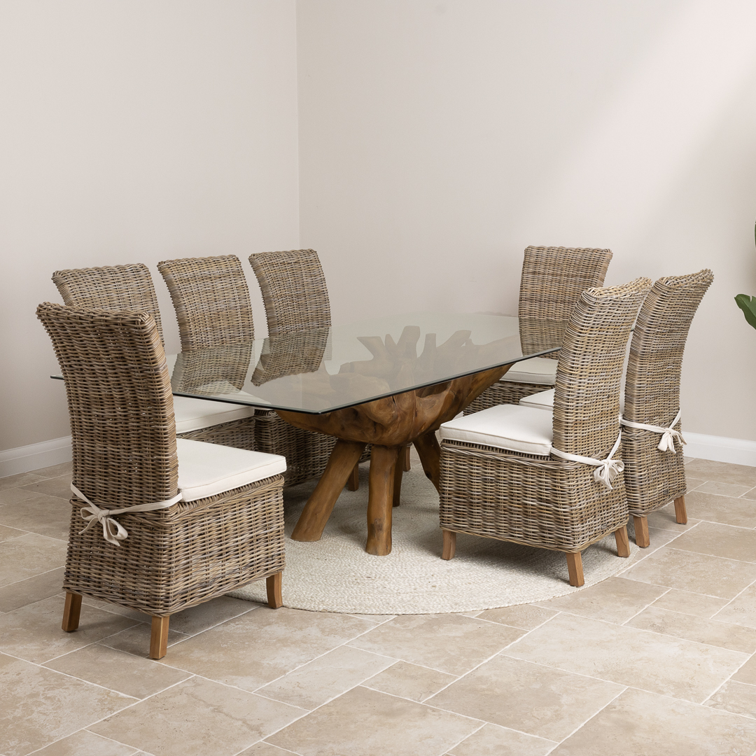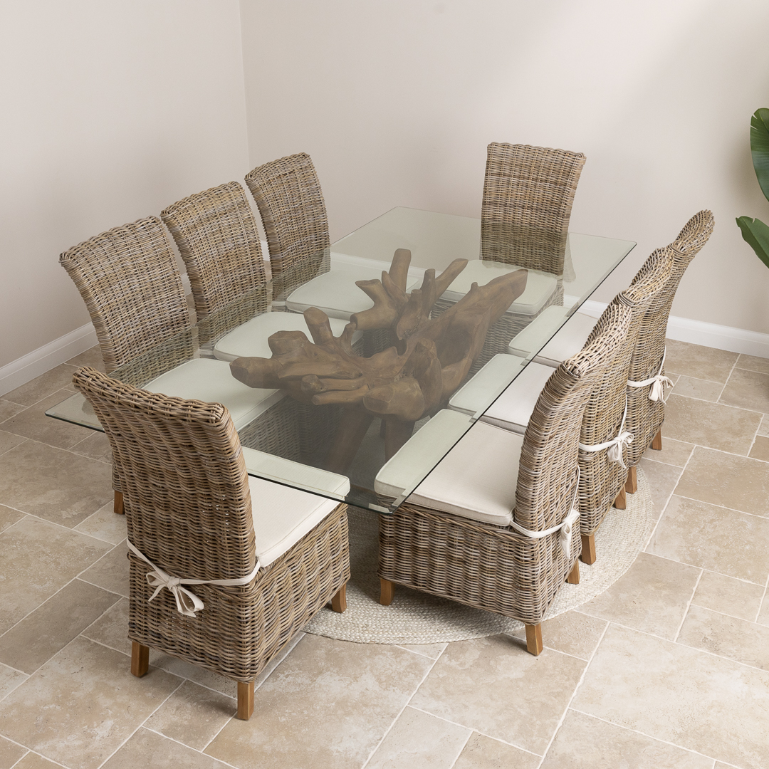 240cm Rectangular Reclaimed Teak Root Indoor Dining Table with 6 or 8 Natural Kubu Wicker Chairs