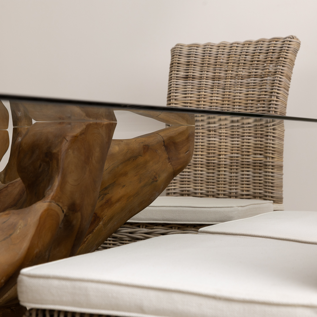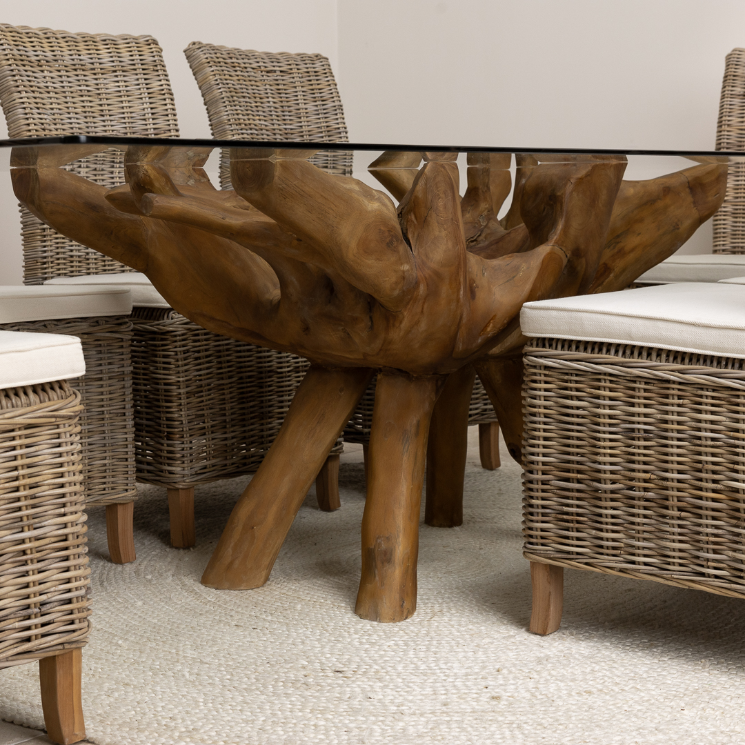 240cm x 120cm Rectangular Reclaimed Teak Root Indoor Dining Table with 10mm Toughened Safety GlassIn stock