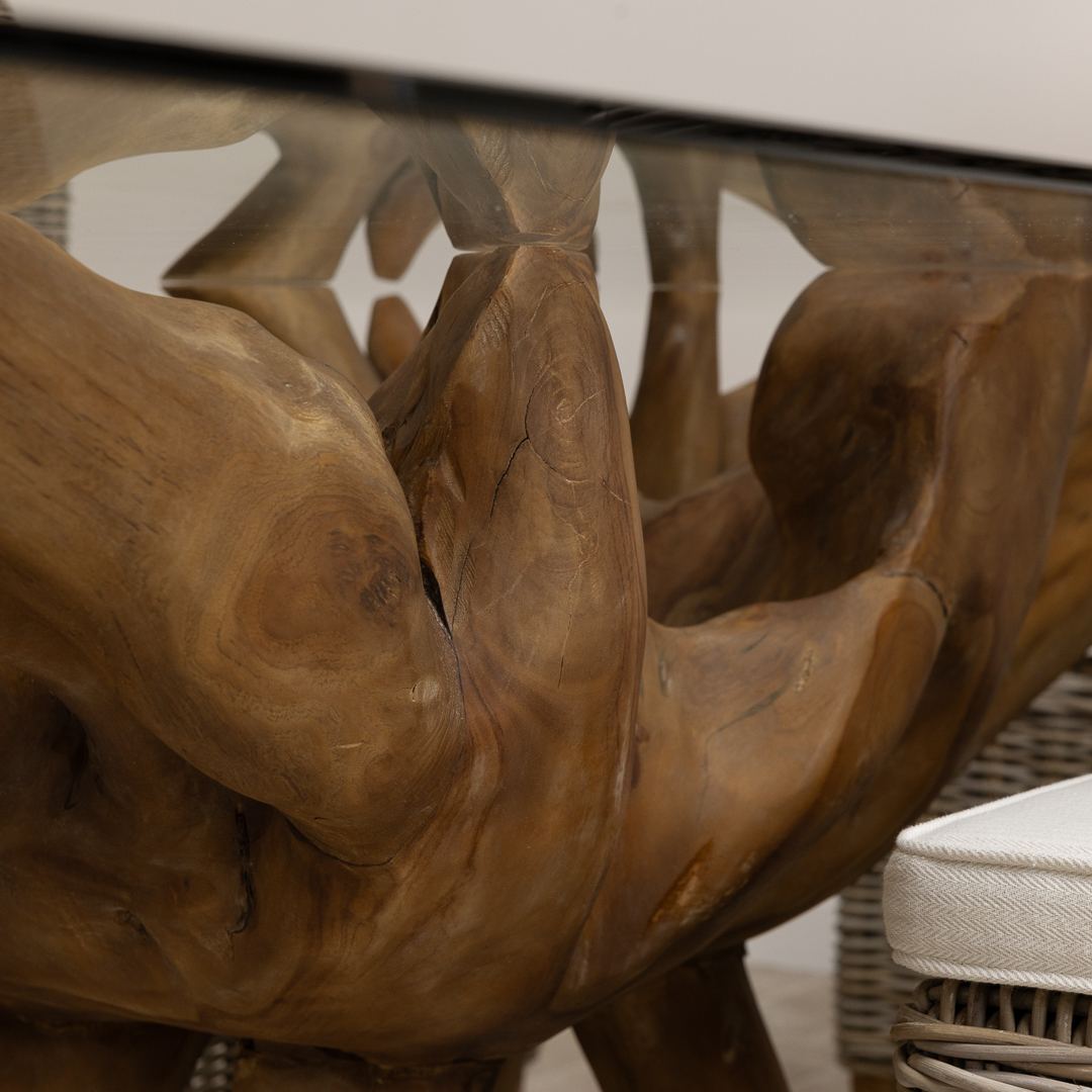 120cm x 80cm Rectangular Reclaimed Teak Root Cross Sectional Coffee Table with 10mm Toughened Safety GlassIn stock