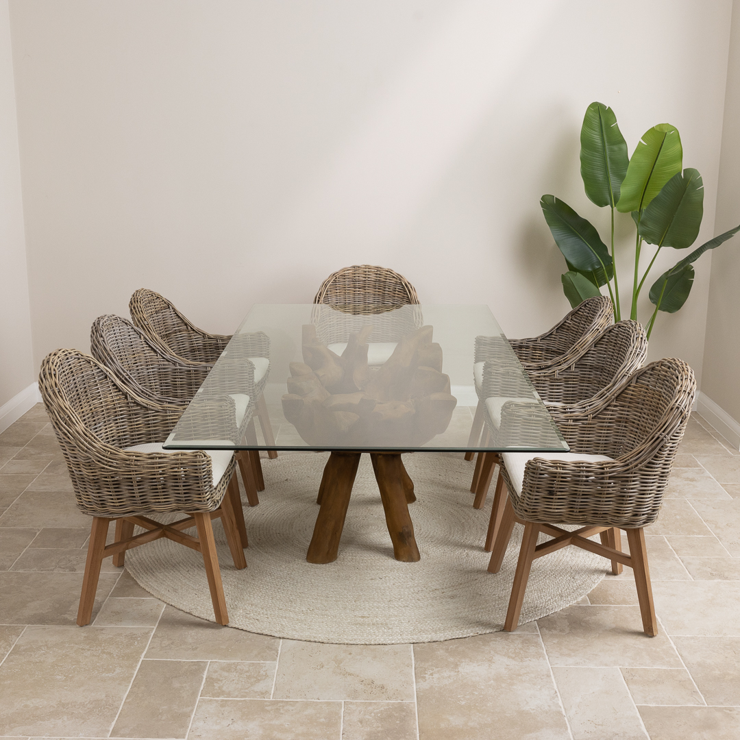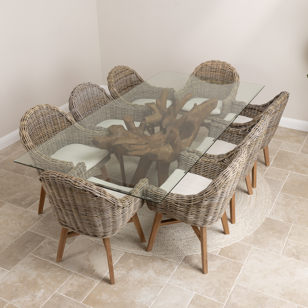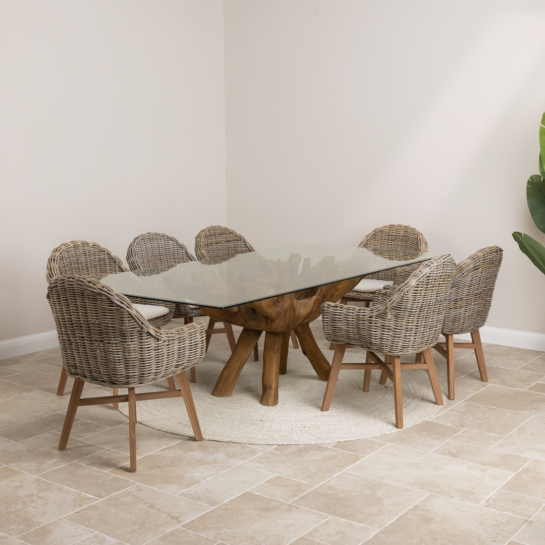 240cm Rectangular Reclaimed Teak Root Indoor Dining Table with 6 or 8 Natural Kubu Wicker ChairsIn stock