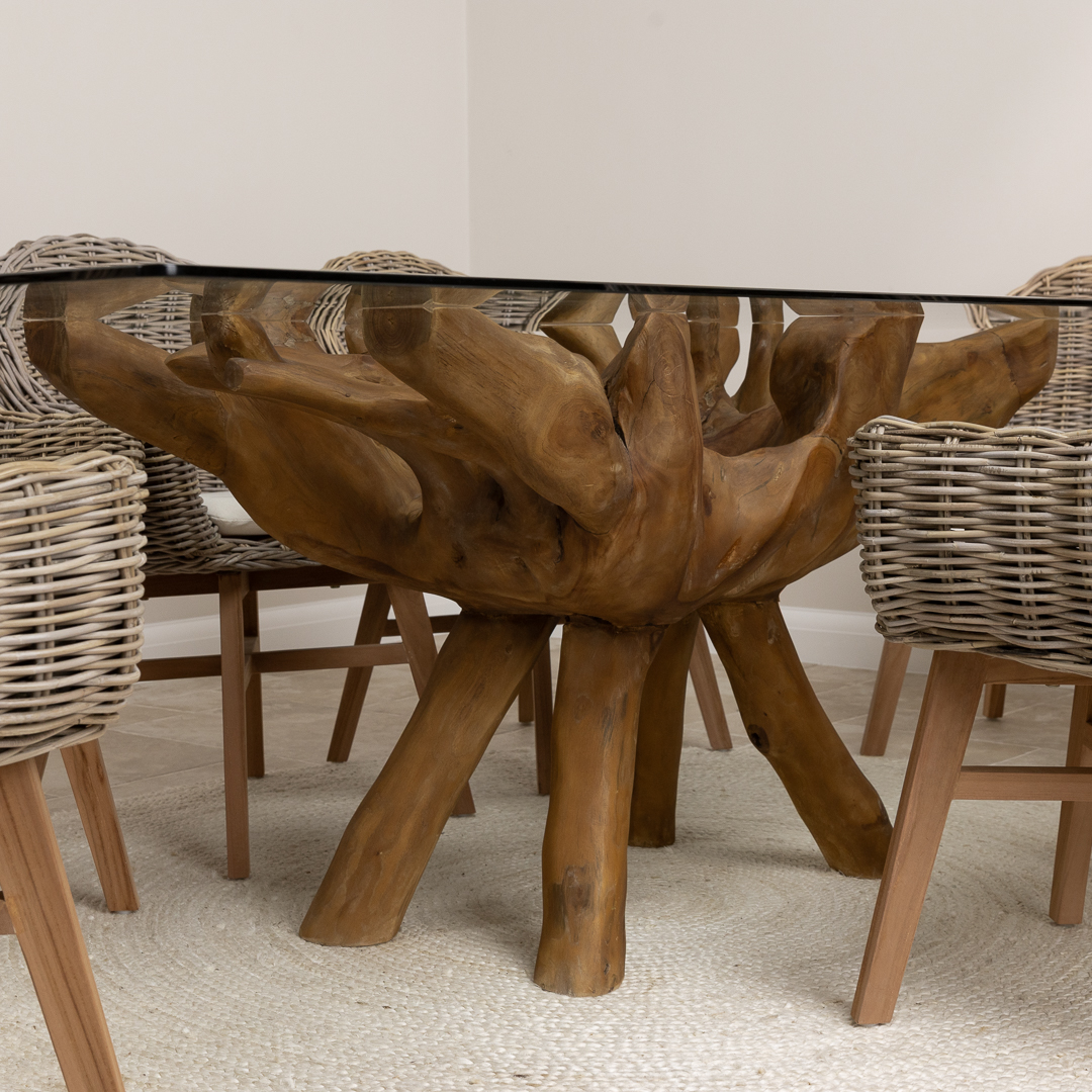 240cm x 120cm Rectangular Reclaimed Teak Root Indoor Dining Table with 10mm Toughened Safety GlassIn stock