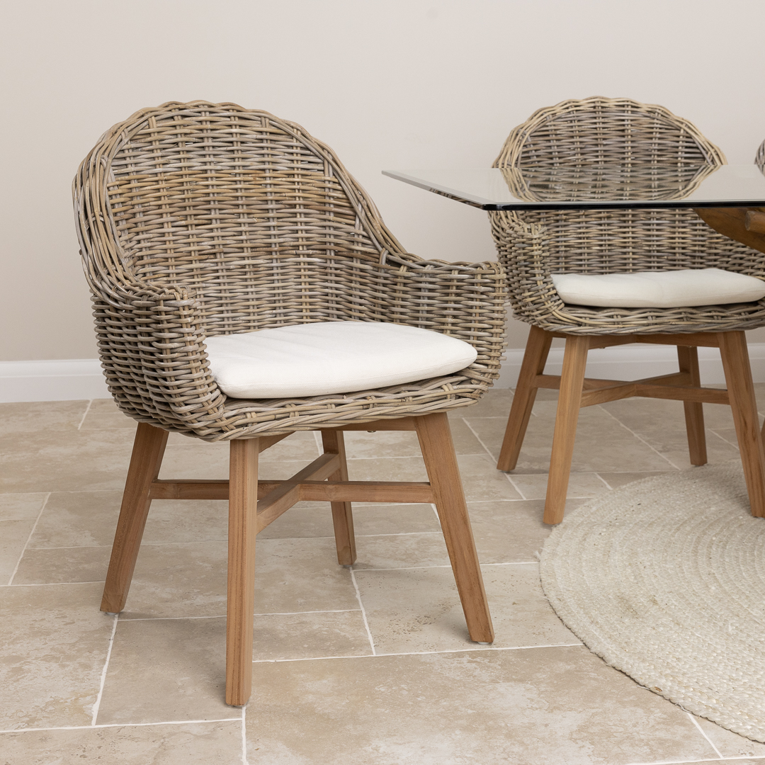 180cm x 120cm Rectangular Reclaimed Teak Root Indoor Dining Table with 4 or 6 Natural Kubu Wicker ChairsIn stock