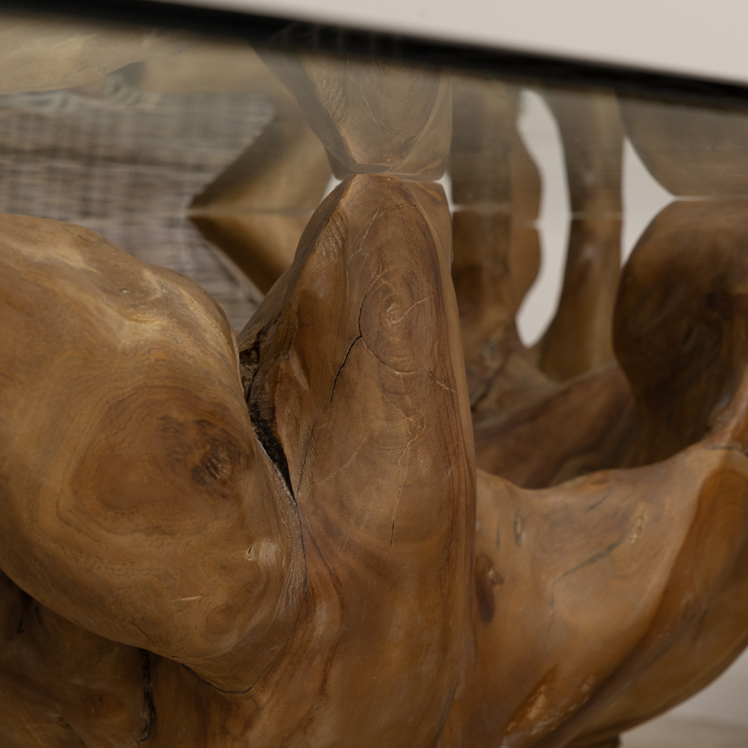 120cm x 80cm Rectangular Reclaimed Teak Root Cross Sectional Coffee Table with 10mm Toughened Safety GlassIn stock