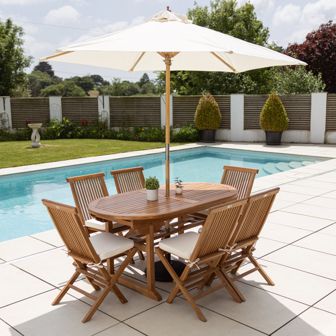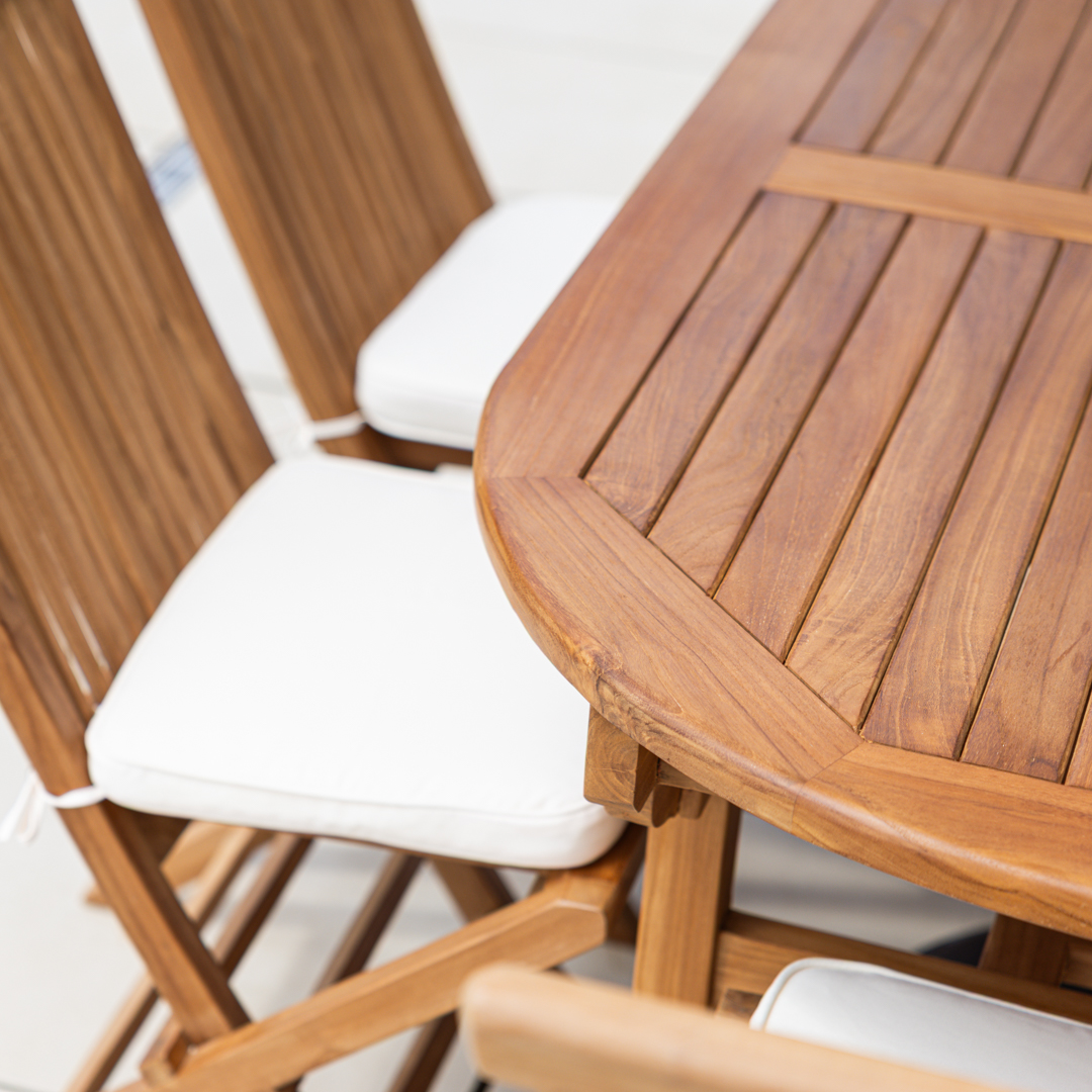 160cm Oval Certified Teak Outdoor Dining Table with 4 or 6 Cora Teak Folding Chairs