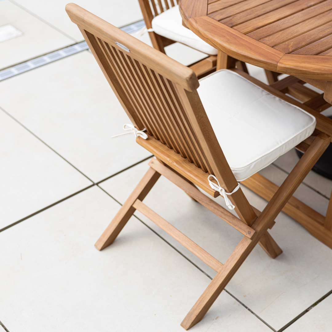 120cm Circular Certified Teak Folding Outdoor Dining Table with 4 Cora Folding ChairsIn stock