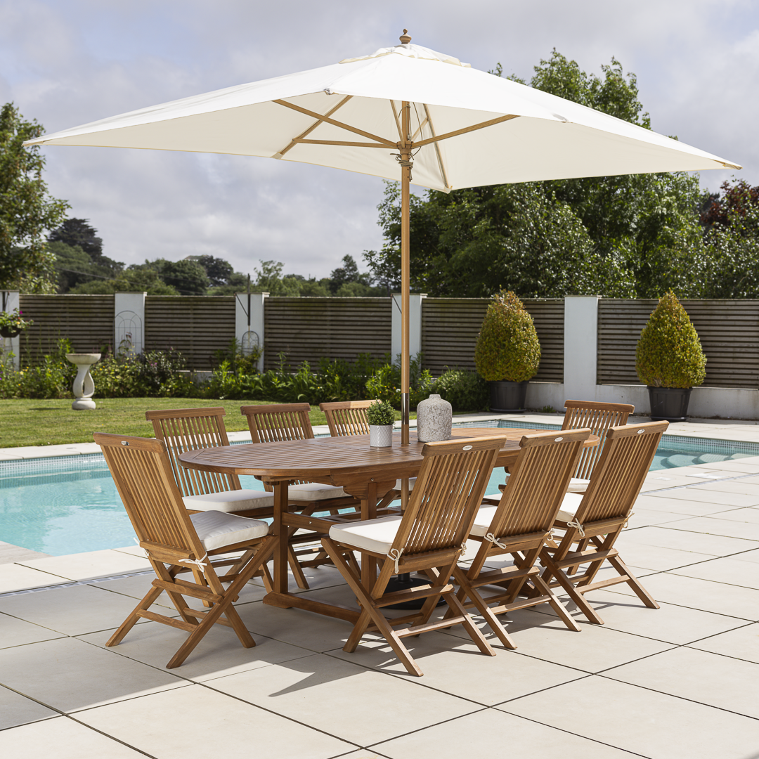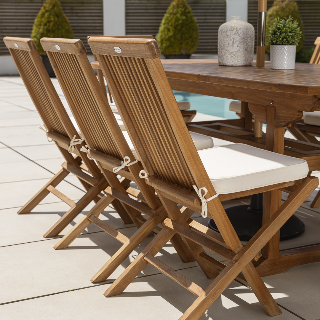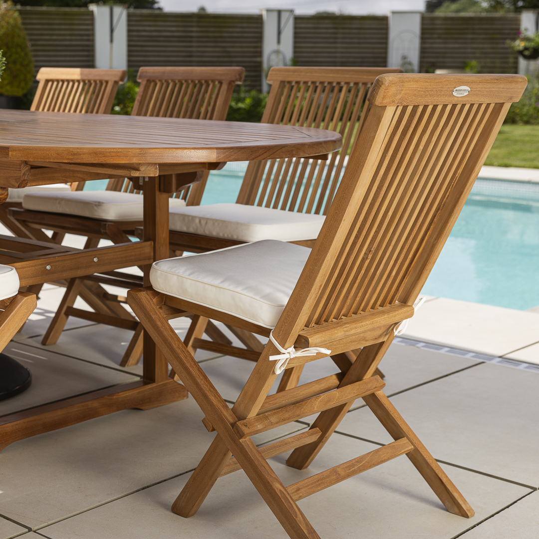 180cm – 240cm Oval Certified Teak Extending Outdoor Dining Table with 6 or 8 Cora Teak Folding Chairs