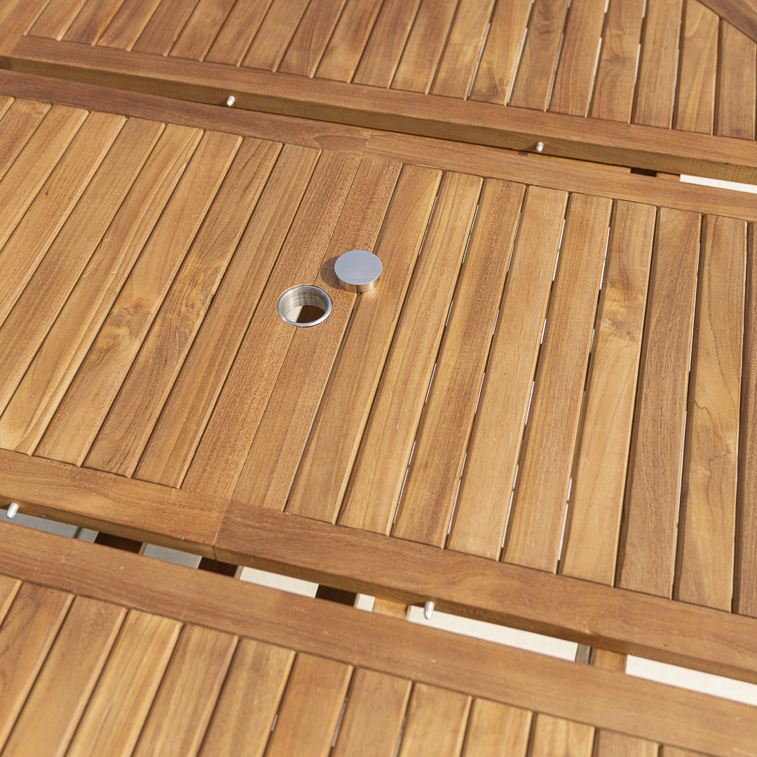 240cm - 320cm Certified Teak Double Extending Cross Leg Outdoor Dining Table with 10 or 12 Scandi ArmchairsIn stock