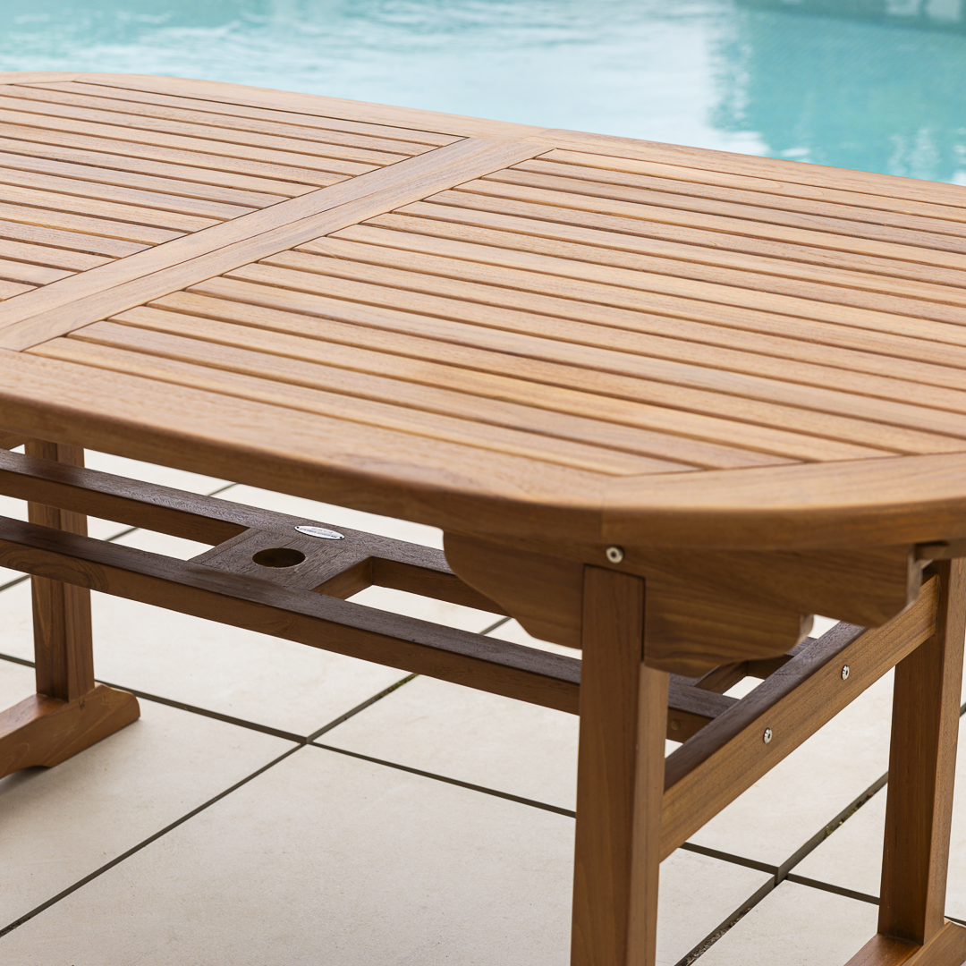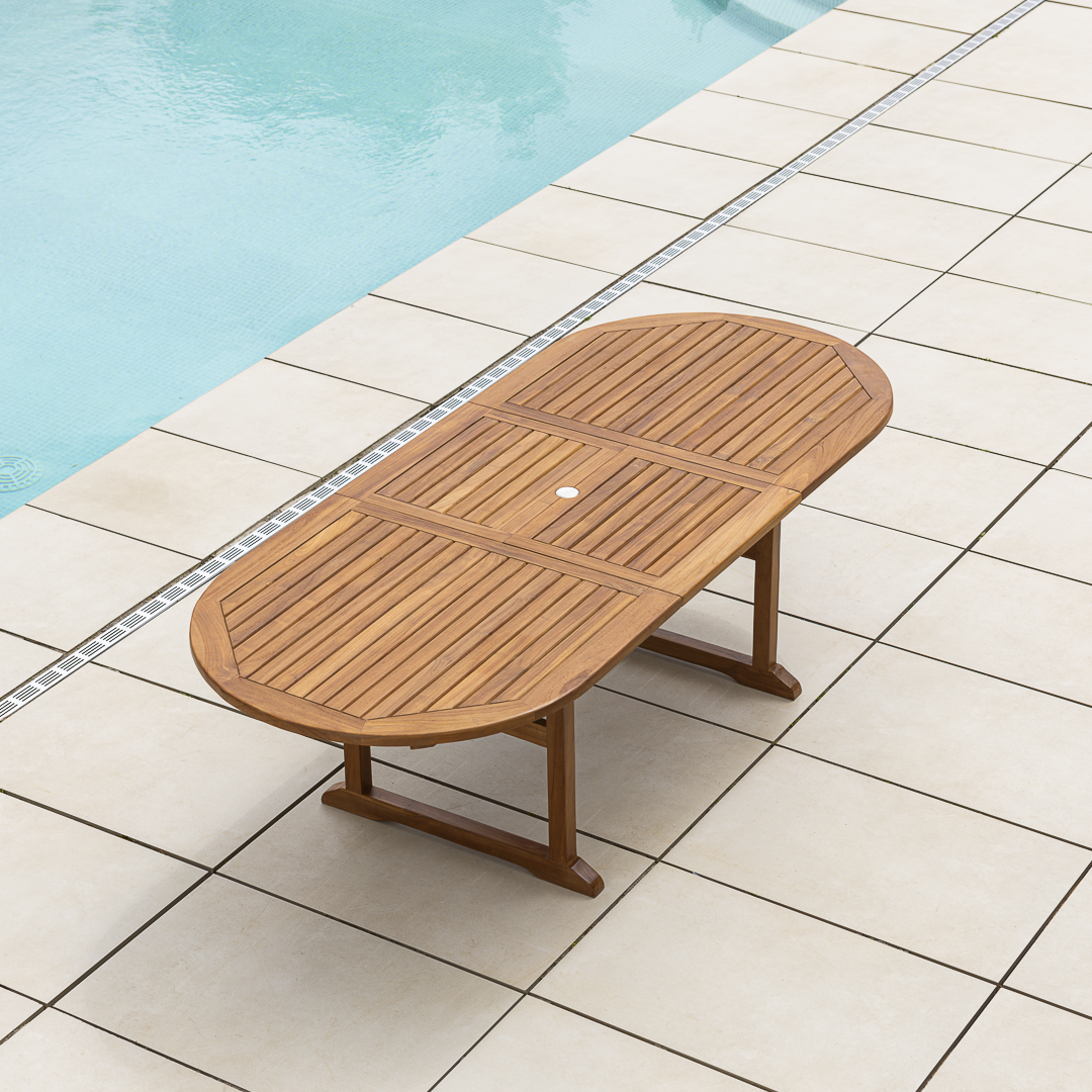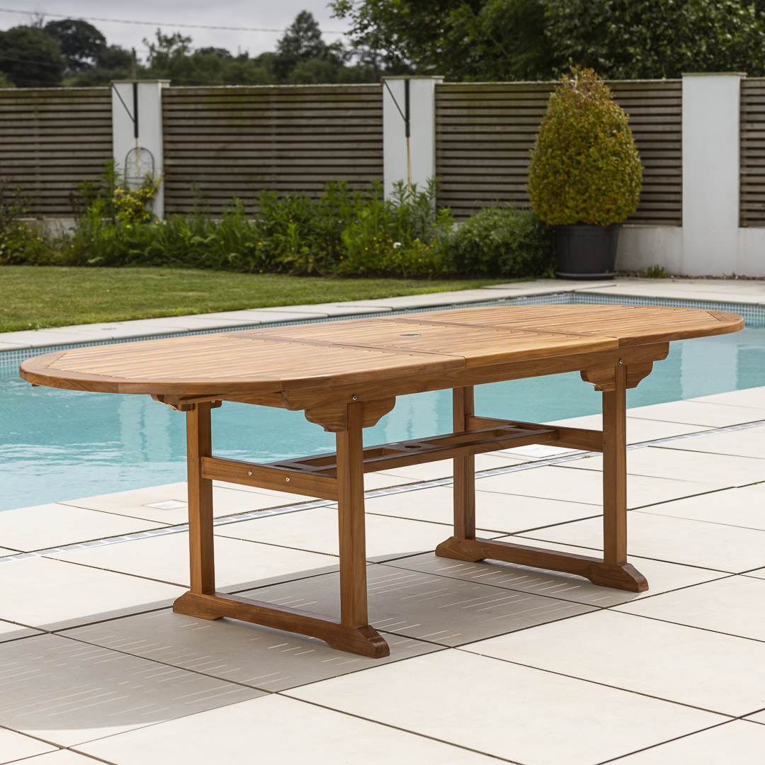 180cm – 240cm Certified Teak Outdoor Oval Extending Dining Table with Butterfly Folding Leaf