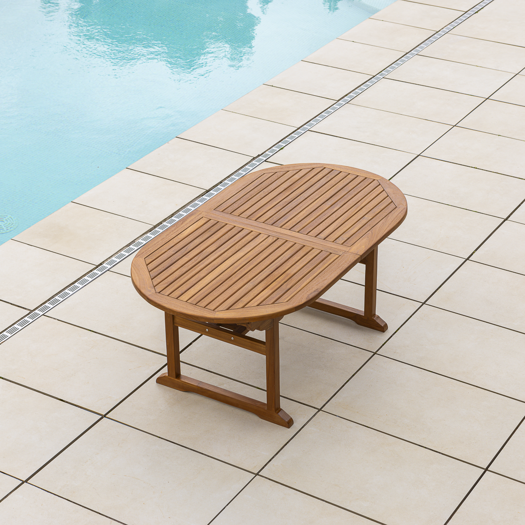 160cm Oval Certified Teak Outdoor Dining Table with 4 or 6 Cora Teak Folding ChairsIn stock
