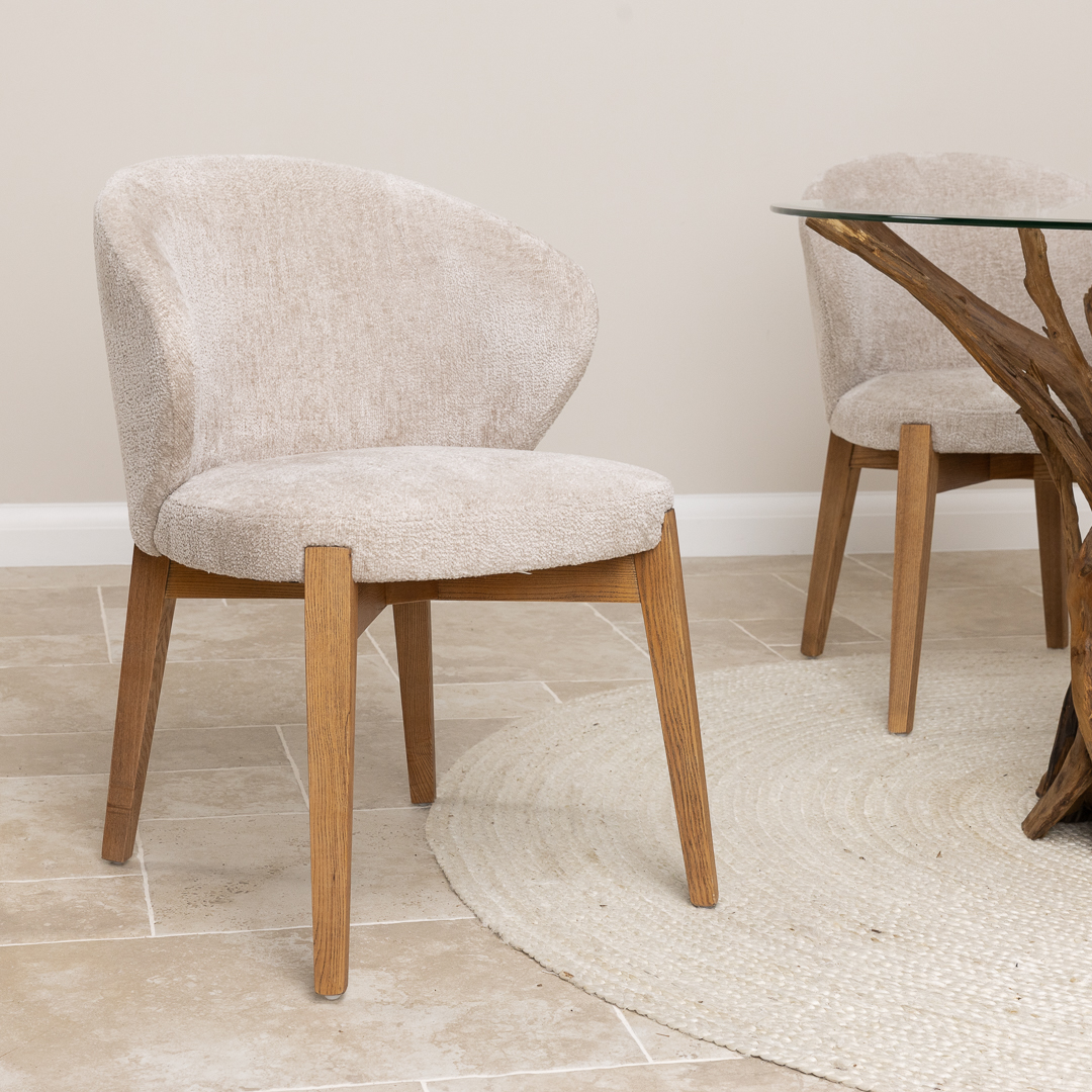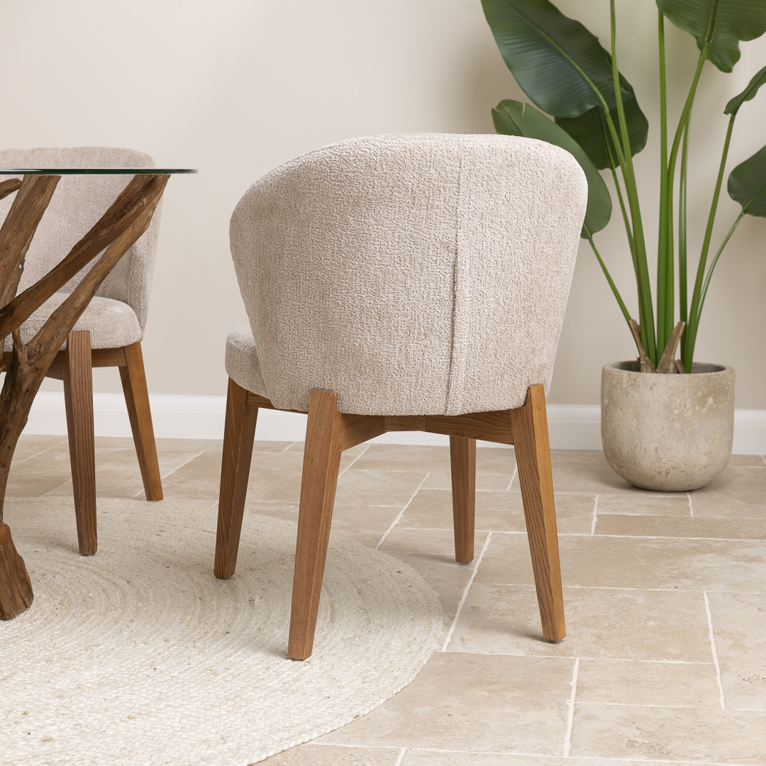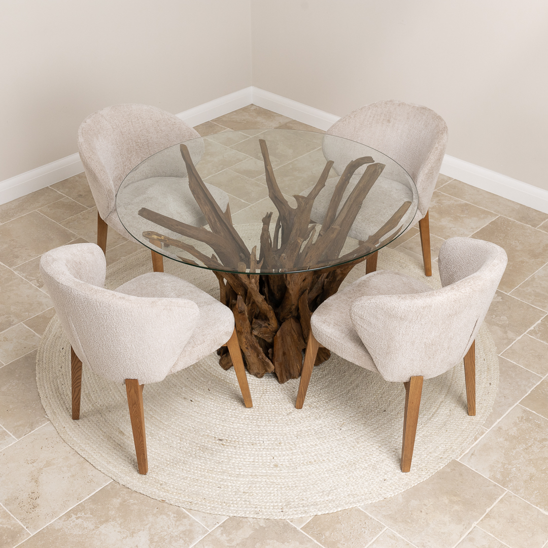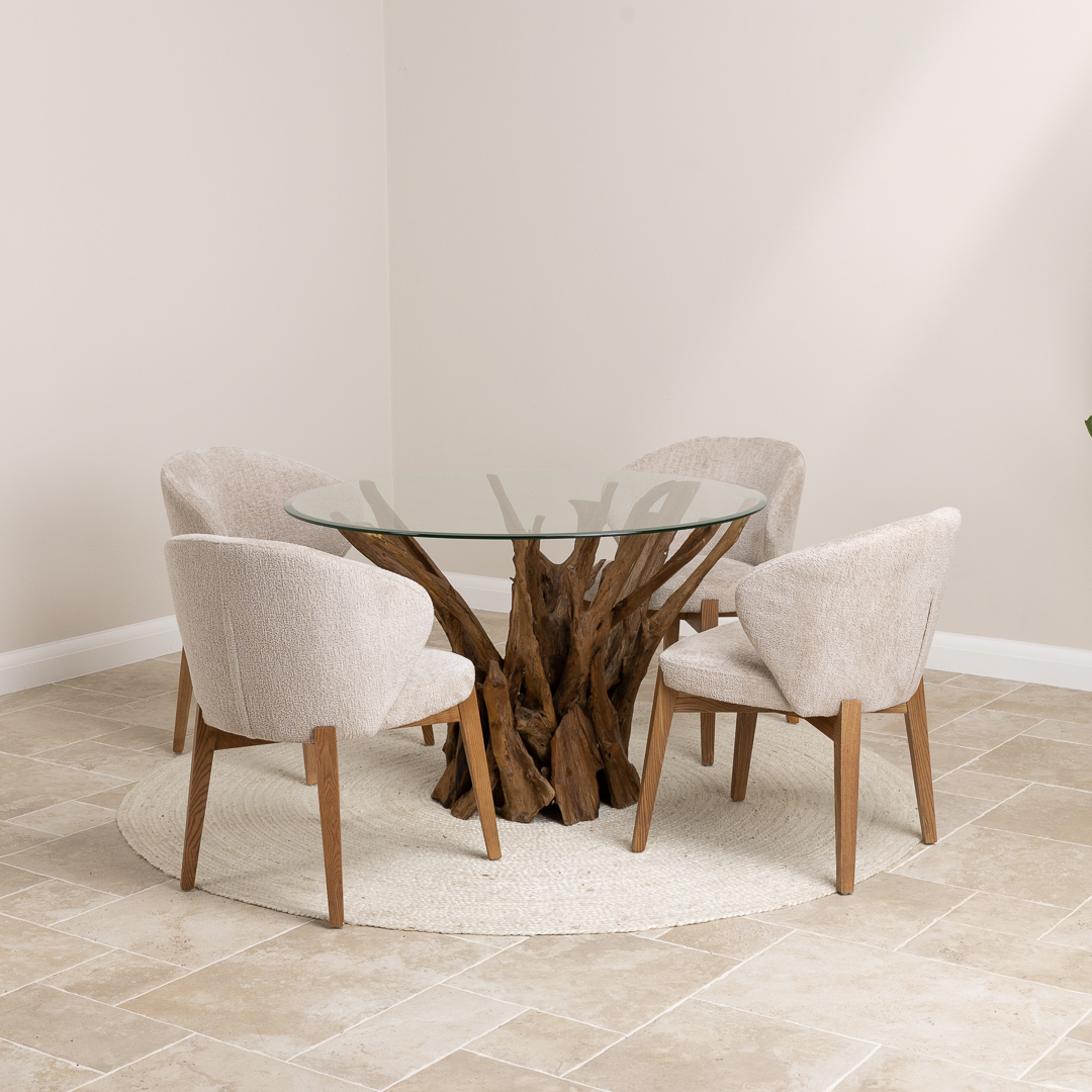 120cm Circular Teak Flute Root Dining Table with 4 Upholstered Cove ChairsIn stock