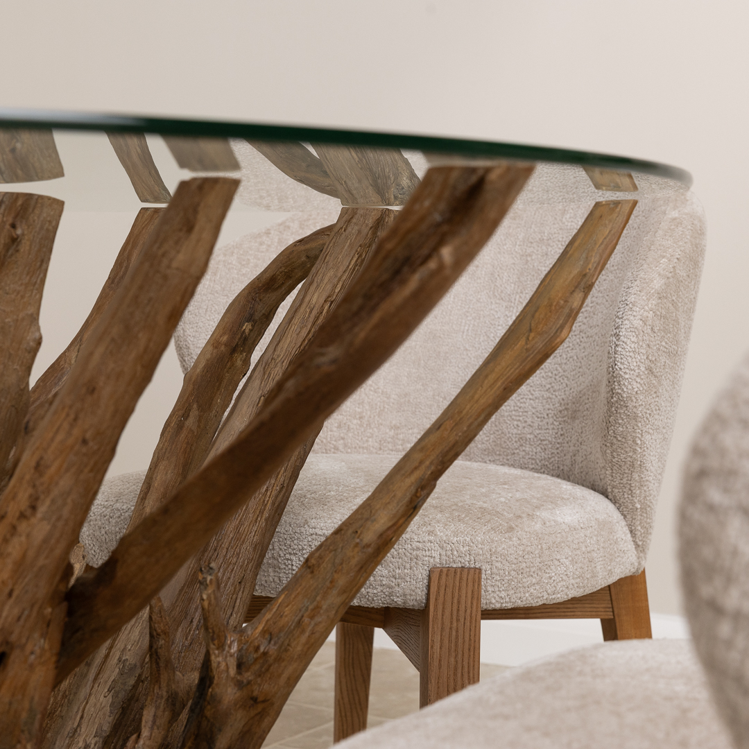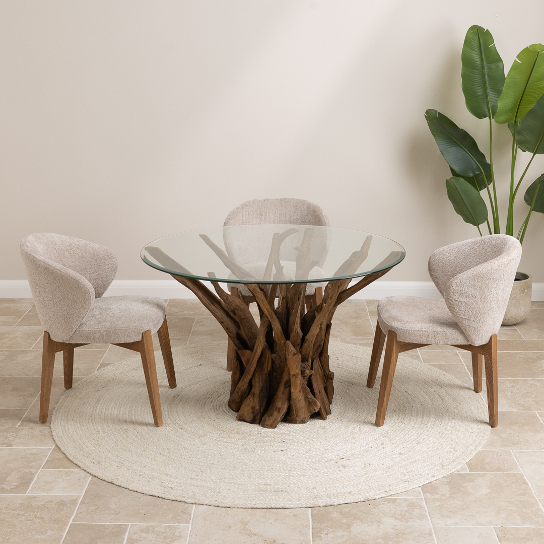 150cm Circular Teak Root Piece Dining Table with 6 Upholstered Cove ChairsIn stock