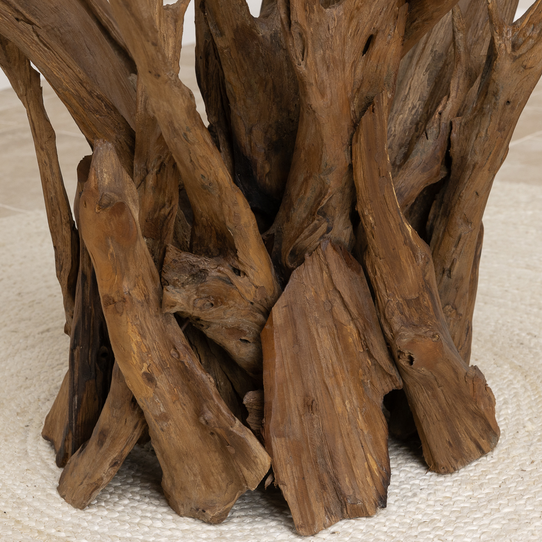 120cm Circular Reclaimed Teak Root Piece Dining Table with 10mm Toughened Safety GlassIn stock