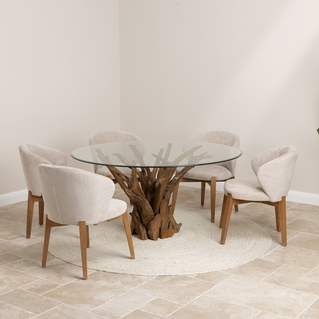 120cm Circular Teak Root Piece Dining Table with 4 Upholstered Cove ChairsIn stock
