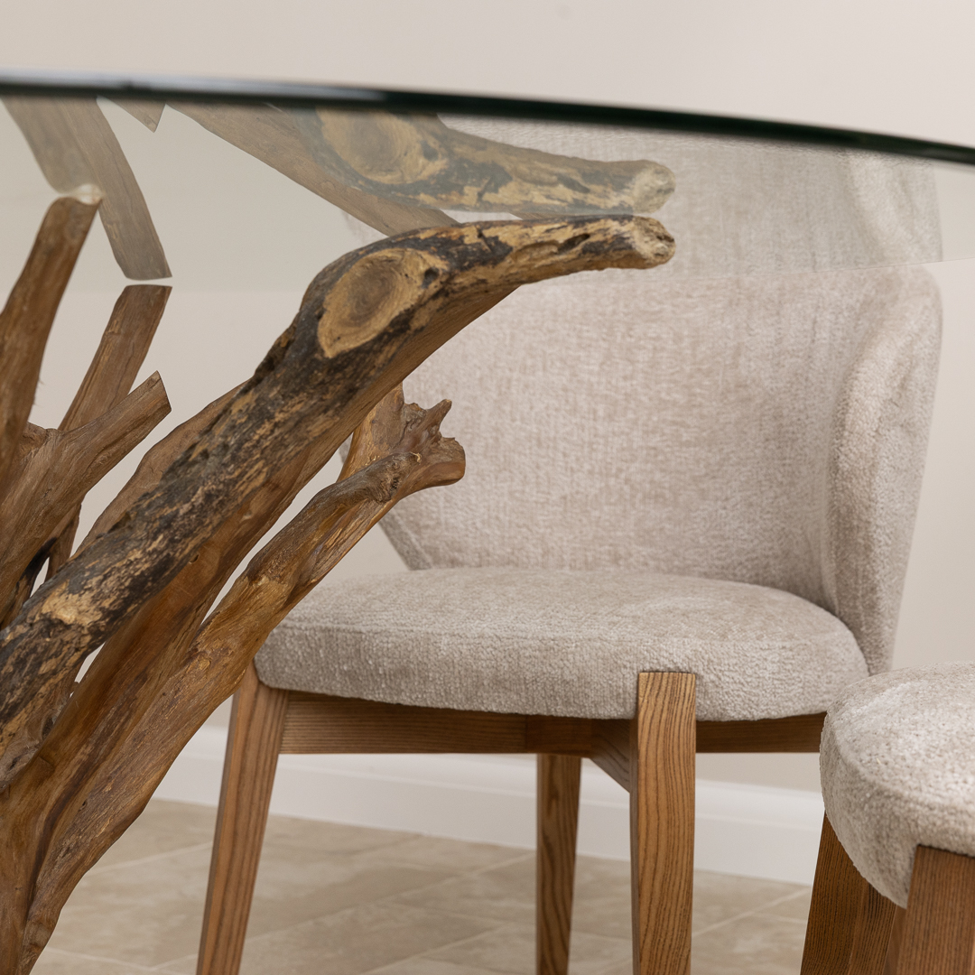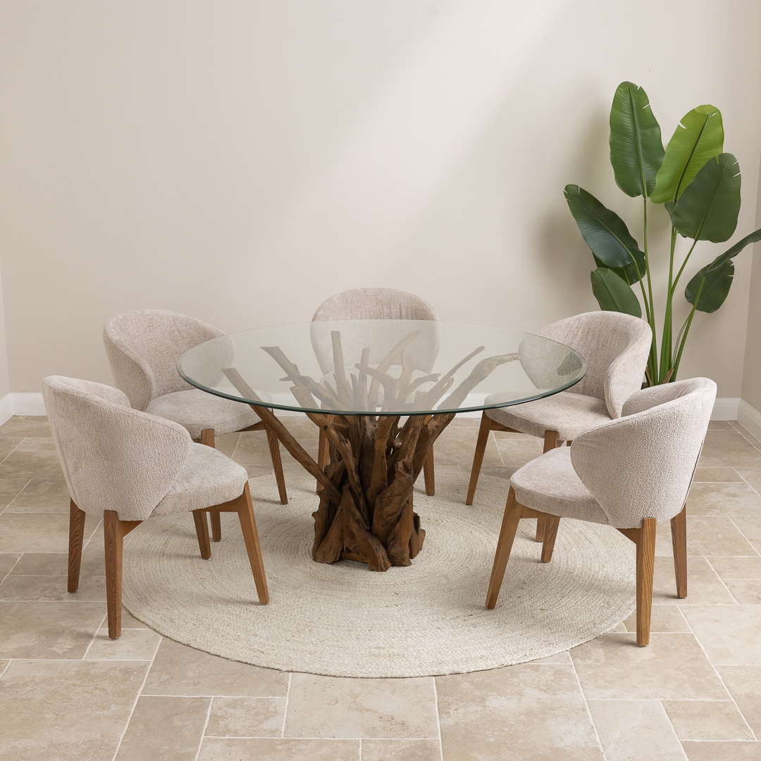 150cm Circular Teak Root Piece Dining Table with 6 Upholstered Cove Chairs