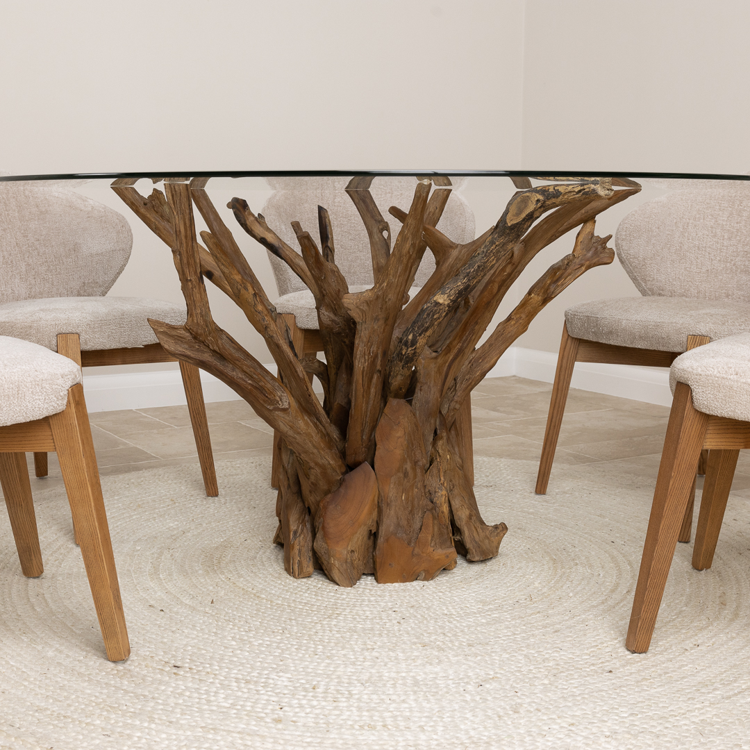 150cm Circular Reclaimed Teak Root Piece Dining Table with 10mm Toughened Safety GlassIn stock