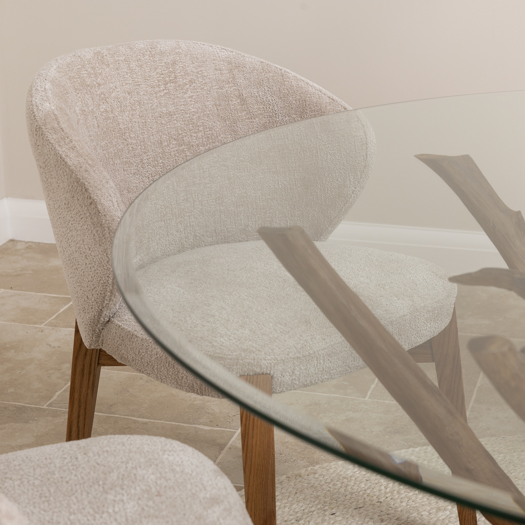 180cm Circular Teak Flute Root Dining Table with 6 Upholstered Cove ChairsIn stock