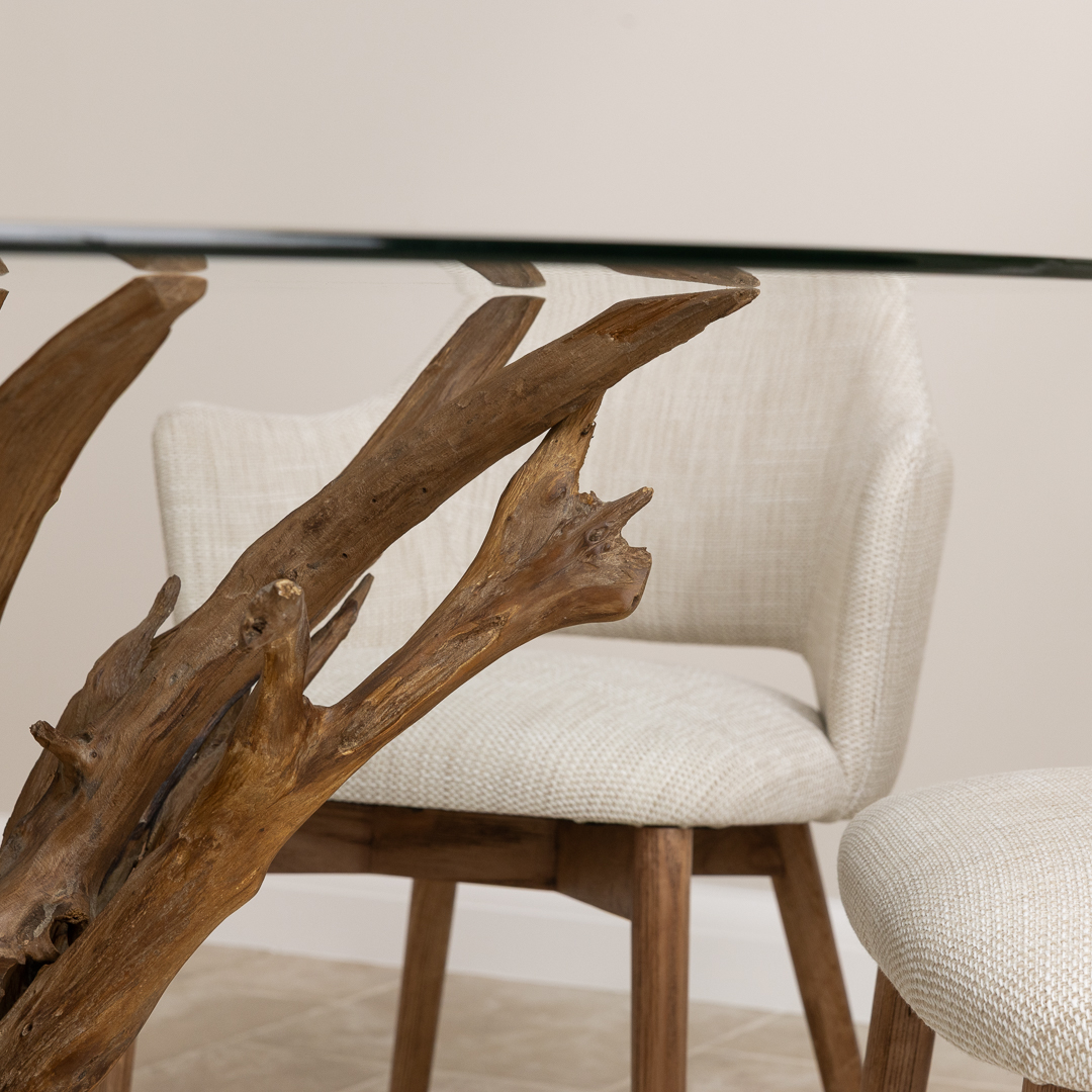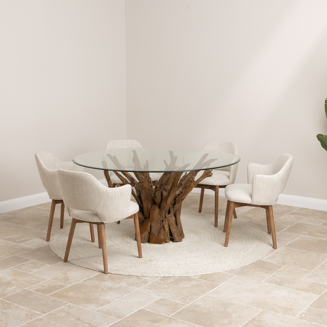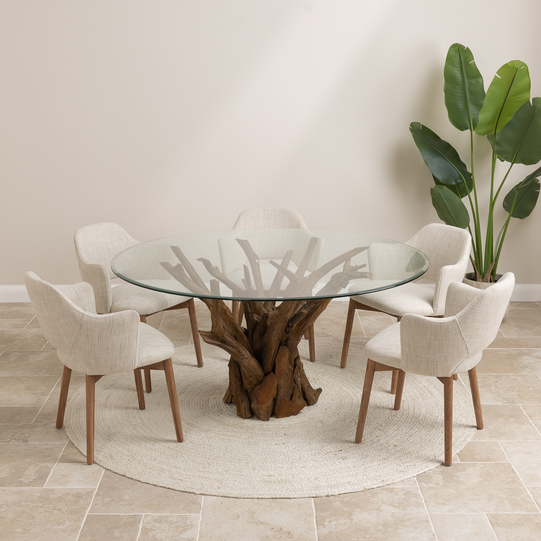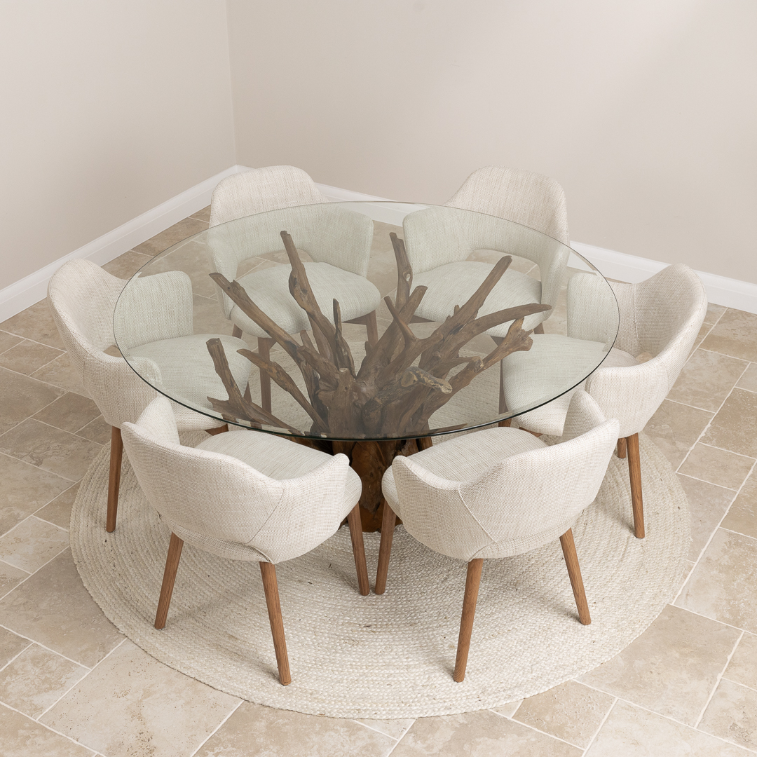 150cm Circular Teak Root Piece Dining Table with 6 Upholstered Cove ChairsIn stock