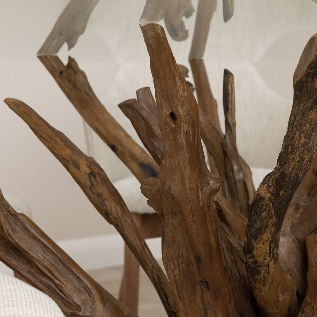 120cm Circular Reclaimed Teak Root Piece Dining Table with 10mm Toughened Safety GlassIn stock