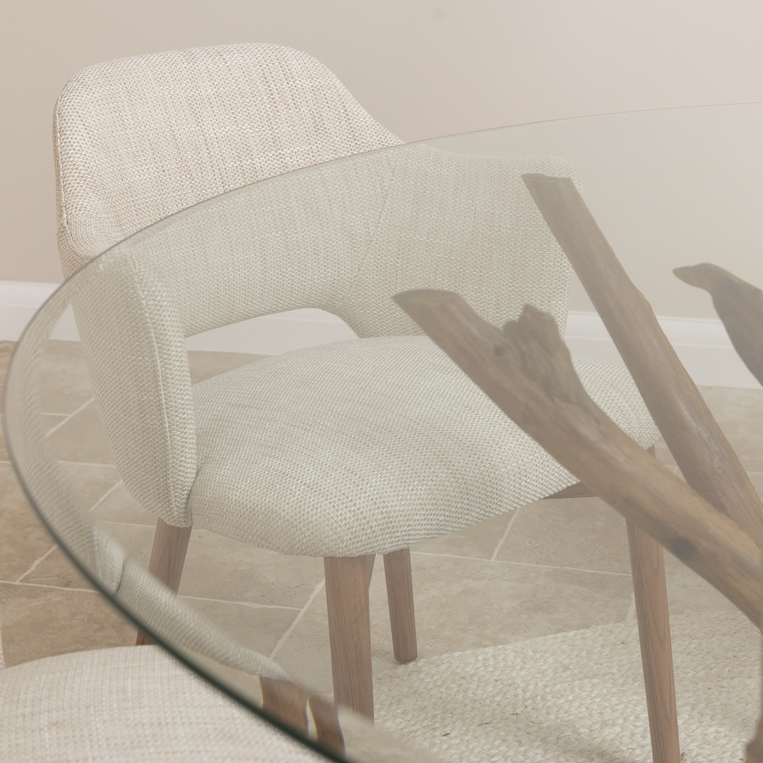 180cm Circular Reclaimed Teak Flute Root Indoor Dining Table with 6 Scandi ArmchairsIn stock