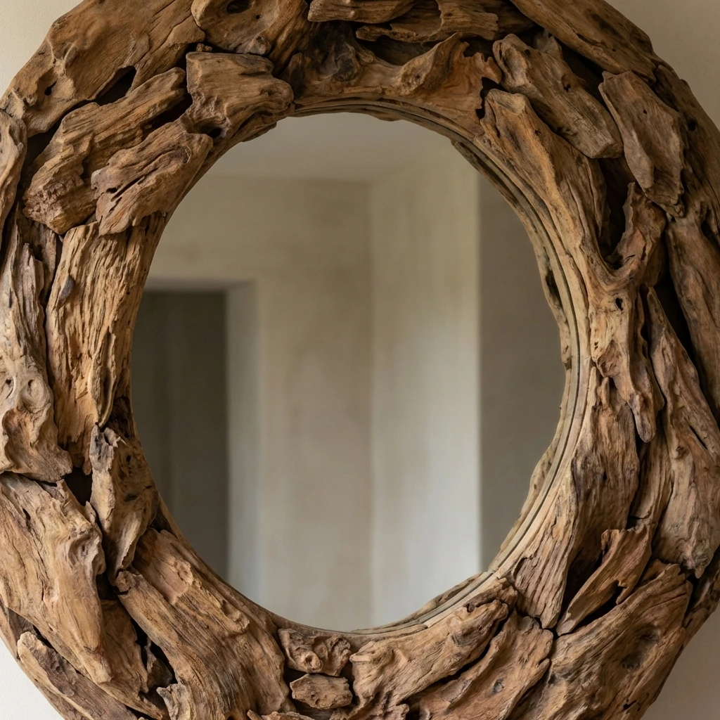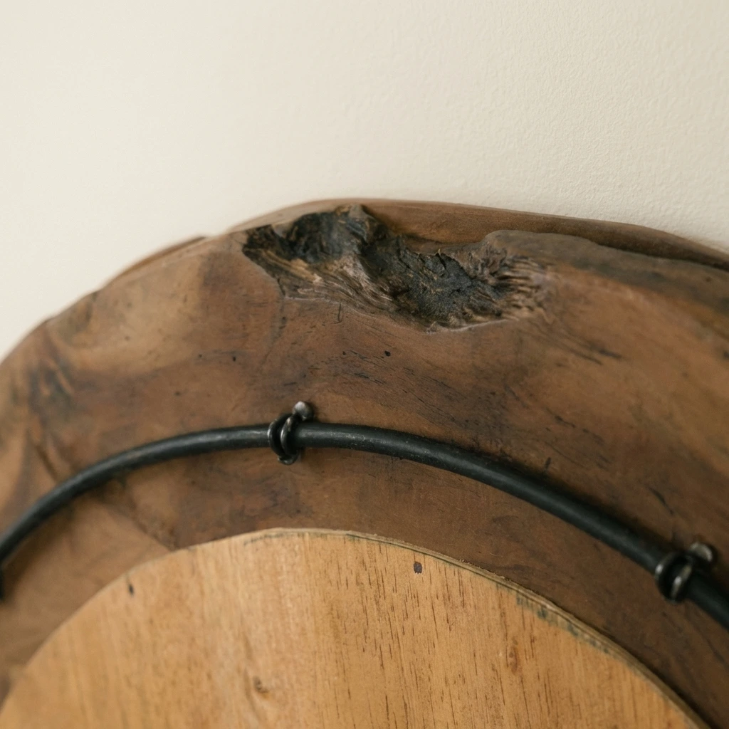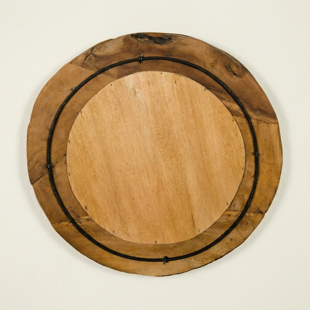 The Hyati Circular Root Piece Mirror showcases a striking frame crafted from reclaimed teak root pieces, each with its own natural texture and character. A sleek iron rim set to the back of the mirror for hanging purposes, this handcrafted mirror blends organic artistry with modern design, creating a bold statement perfect for hallways, living rooms, or feature walls.