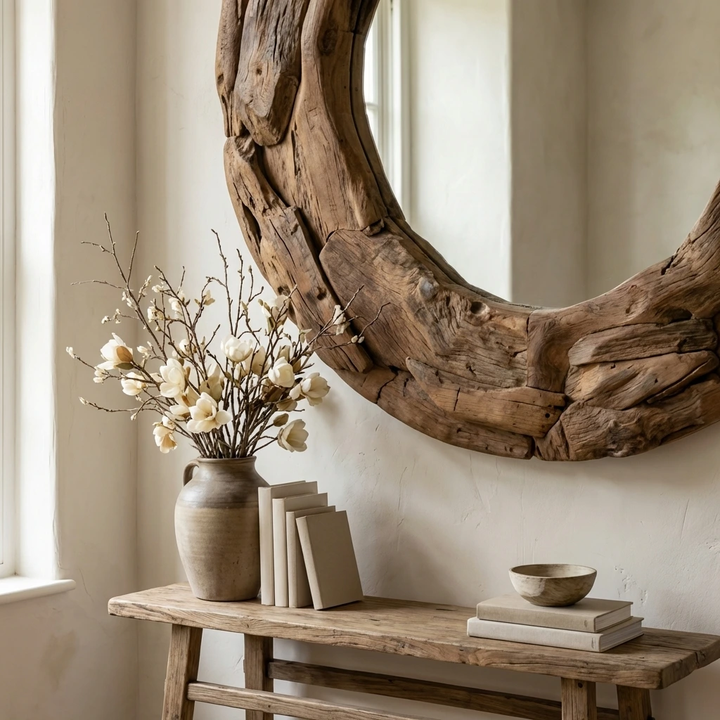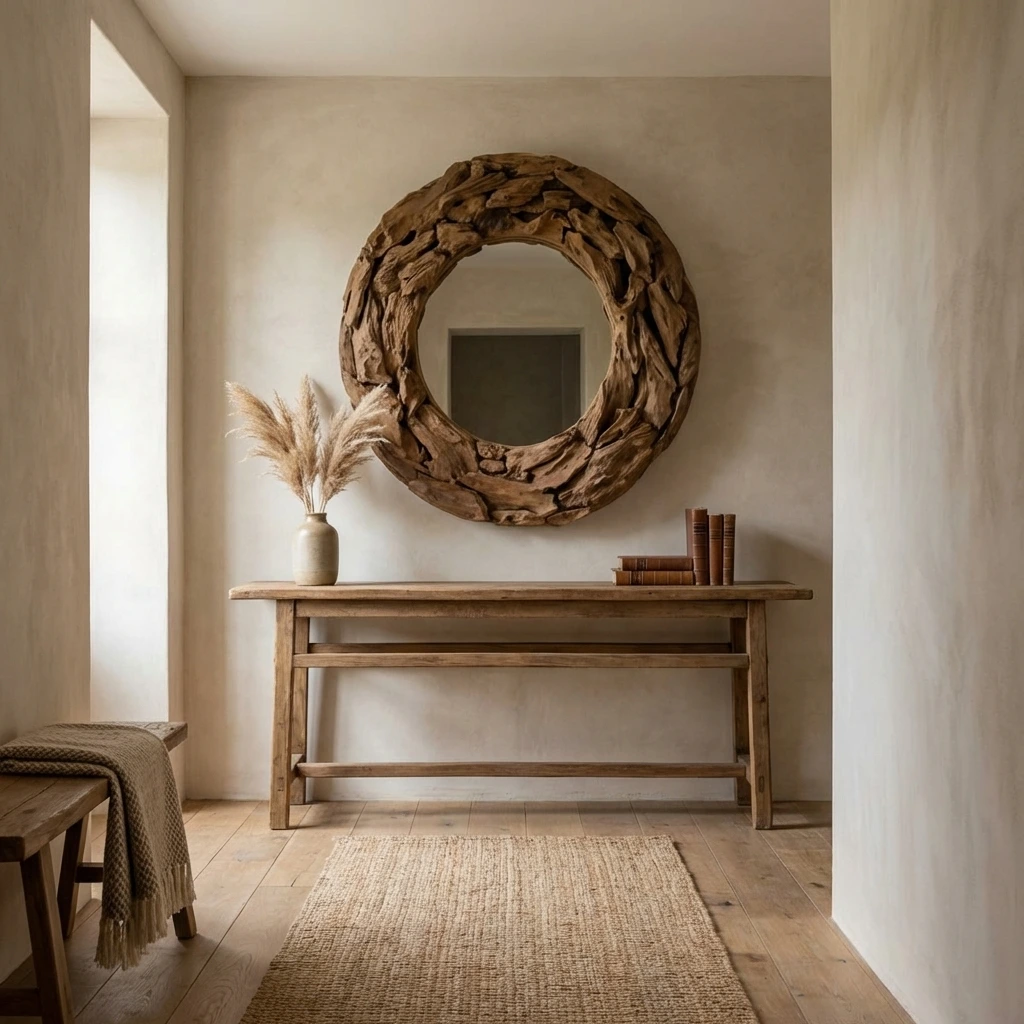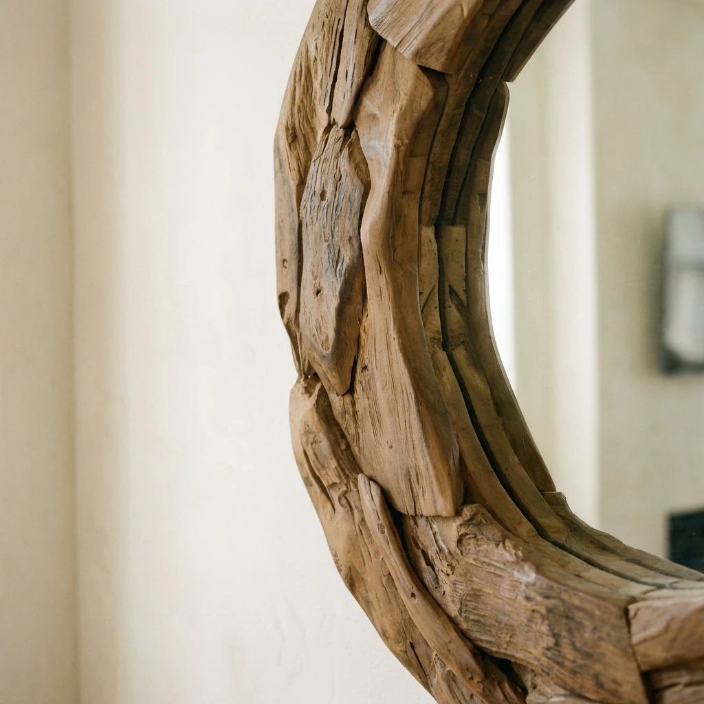 The Hyati Circular Root Piece Mirror showcases a striking frame crafted from reclaimed teak root pieces, each with its own natural texture and character. A sleek iron rim set to the back of the mirror for hanging purposes, this handcrafted mirror blends organic artistry with modern design, creating a bold statement perfect for hallways, living rooms, or feature walls.