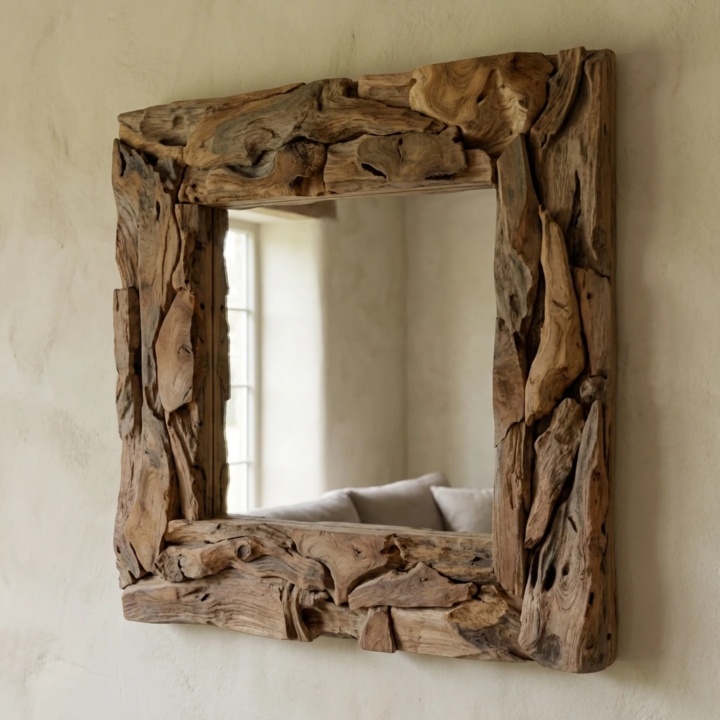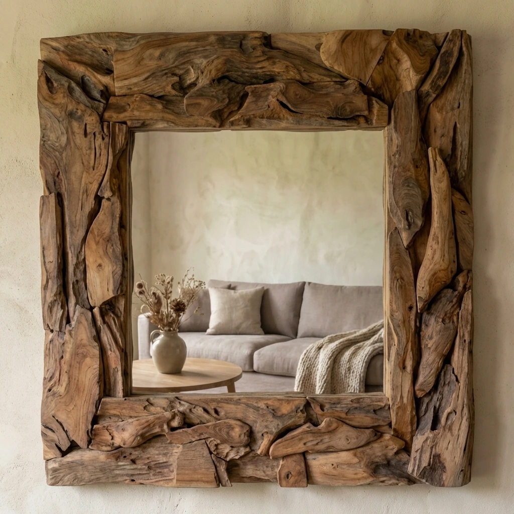 Reclaimed Teak Root Piece Square Mirror with Iron Frame