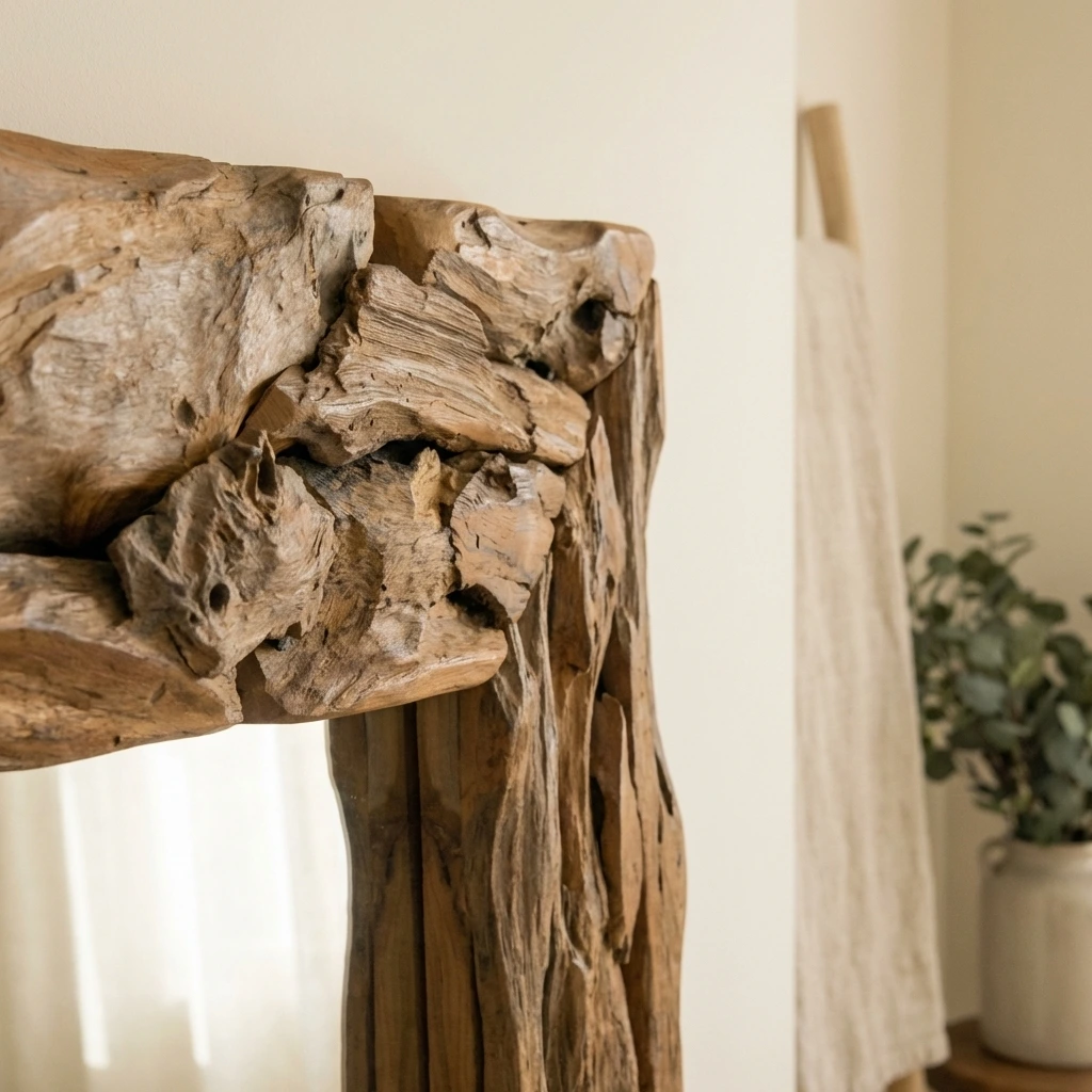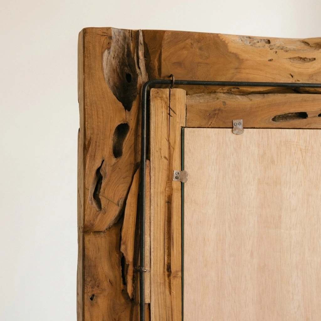 The Hyati Square Root Piece Mirror features a striking frame handcrafted from reclaimed teak root pieces, each showcasing rich natural texture and unique organic patterns. Finished with a sturdy iron frame set on to the back of the mirror for hanging purposes. This bold square mirror comes in two sizes, blending rustic artistry with contemporary design, creating a captivating focal point for any interior space.
