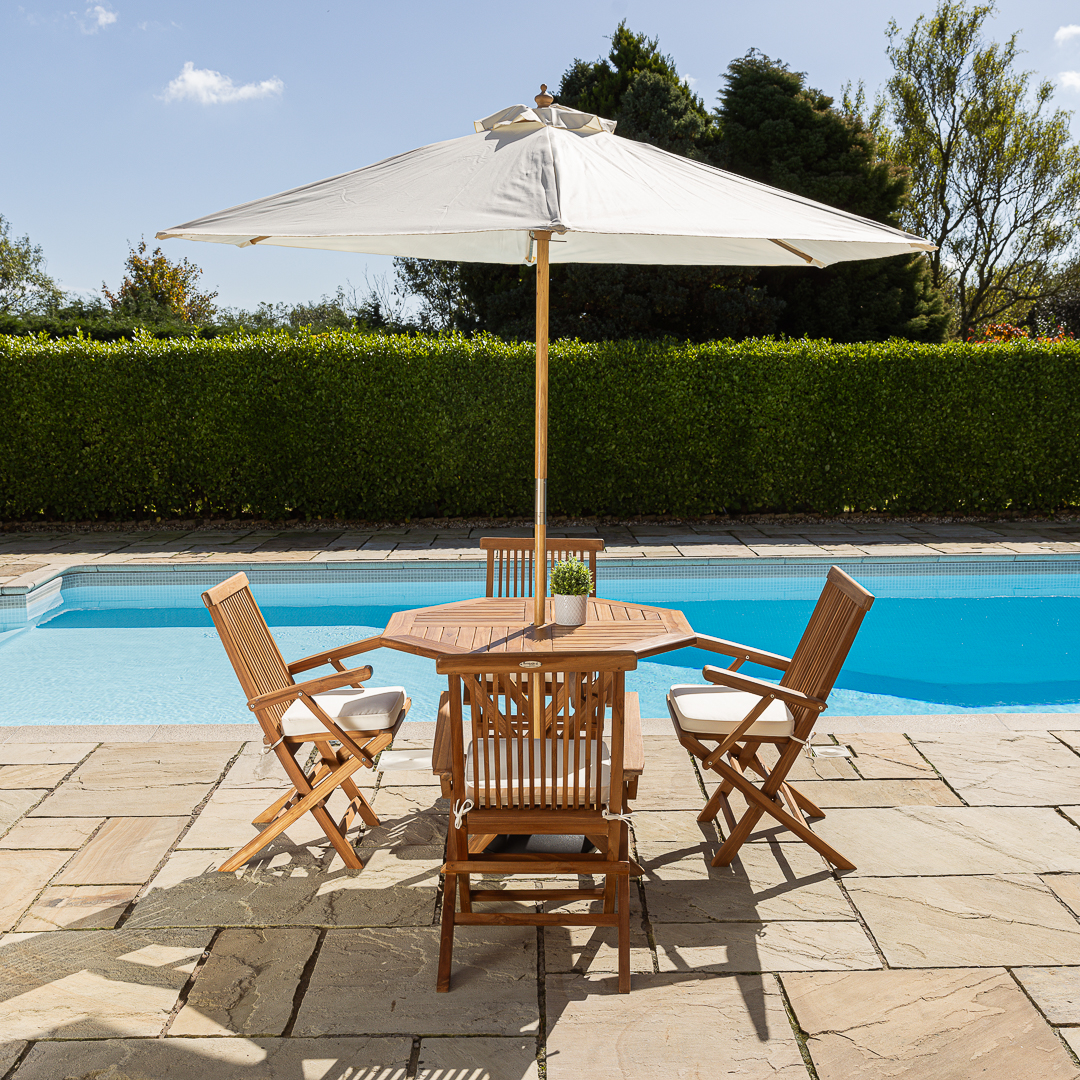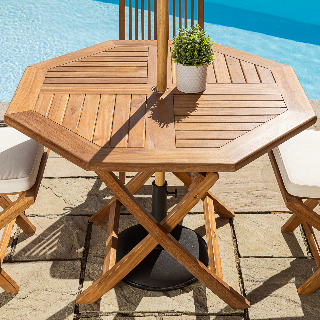 120cm Octagonal Certified Teak Folding Outdoor Dining Table with 4 Marley Teak Stacking ChairsIn stock