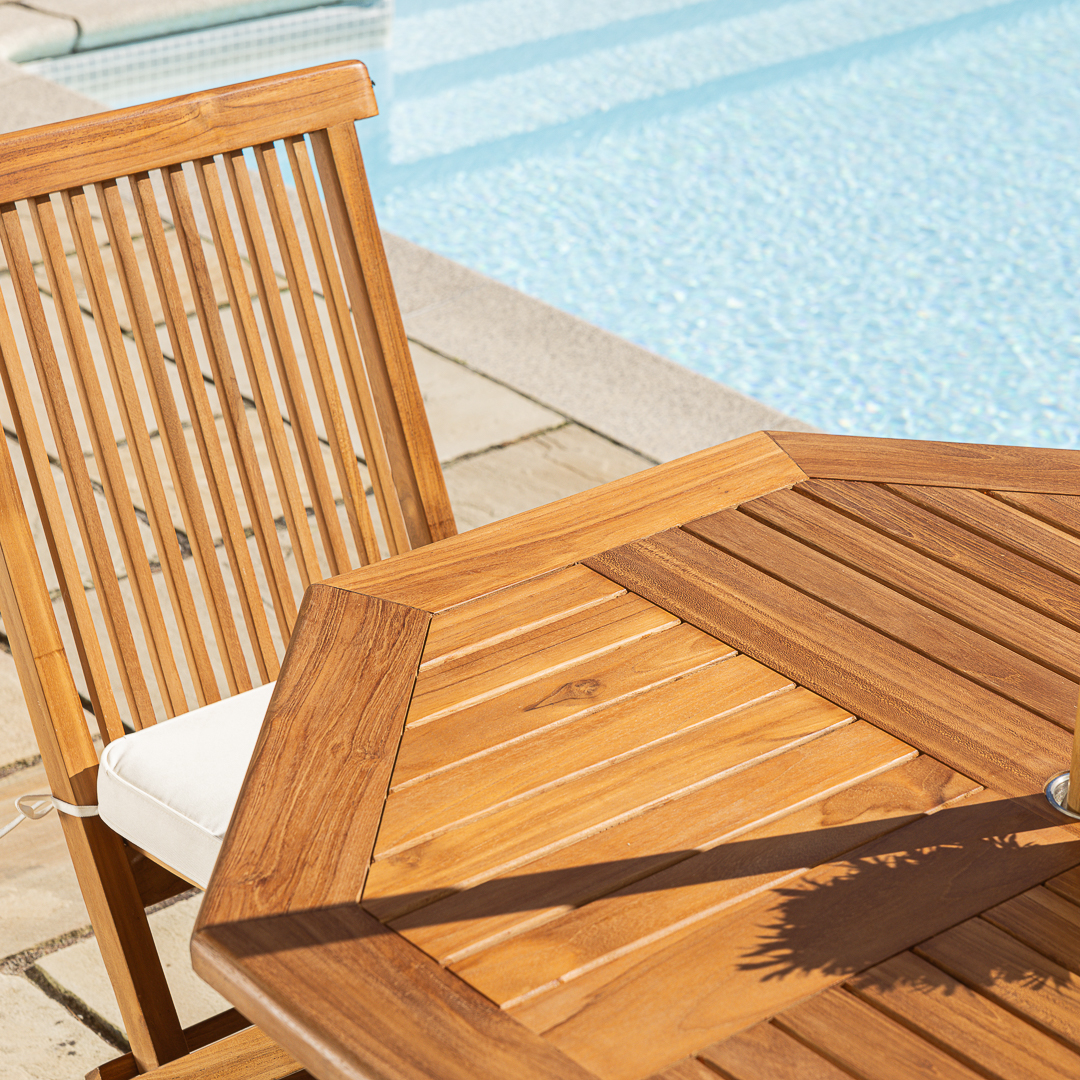 120cm Octagonal Certified Teak Folding Outdoor Dining Table with 6 Marley Teak Stacking ChairsIn stock