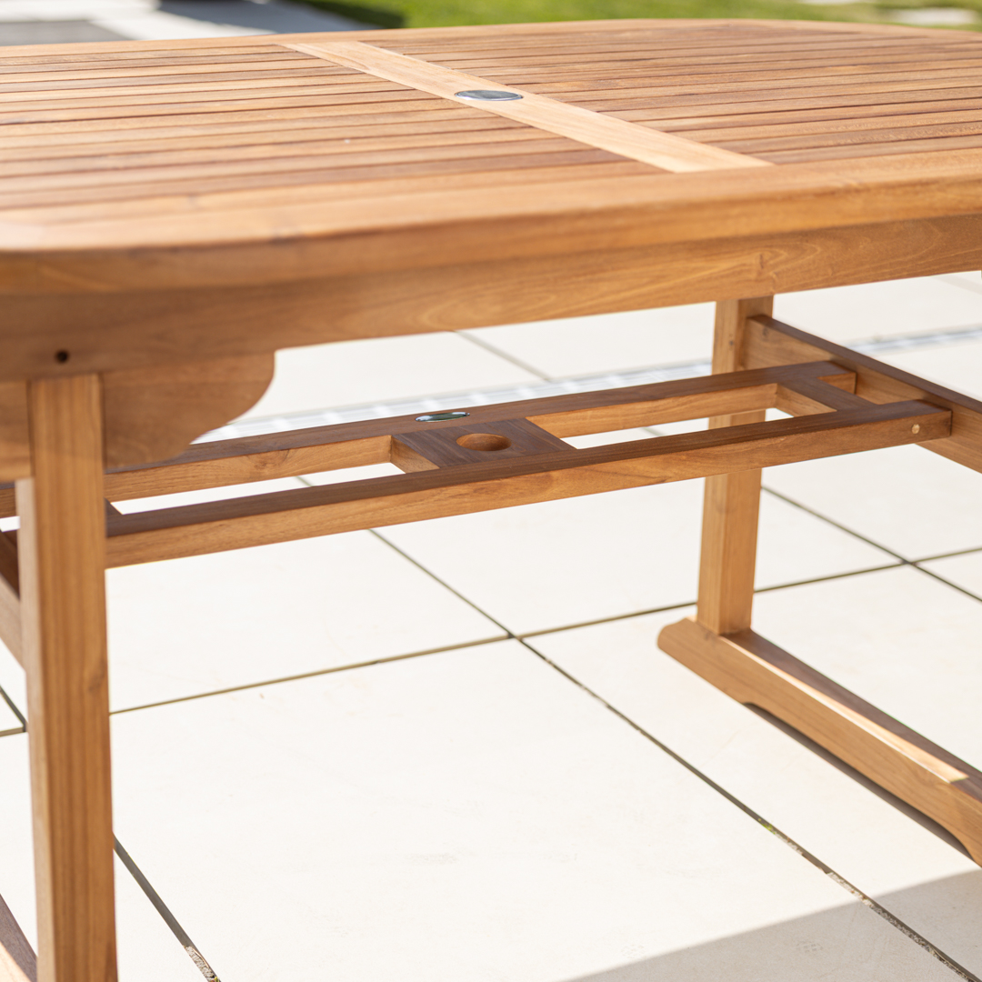 240cm - 320cm Certified Teak Double Extending Cross Leg Outdoor Dining Table with 10 or 12 Scandi ArmchairsIn stock
