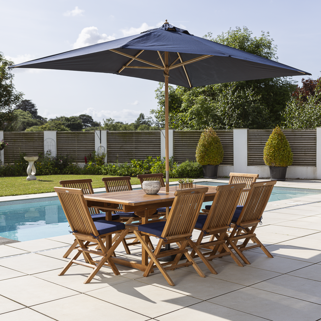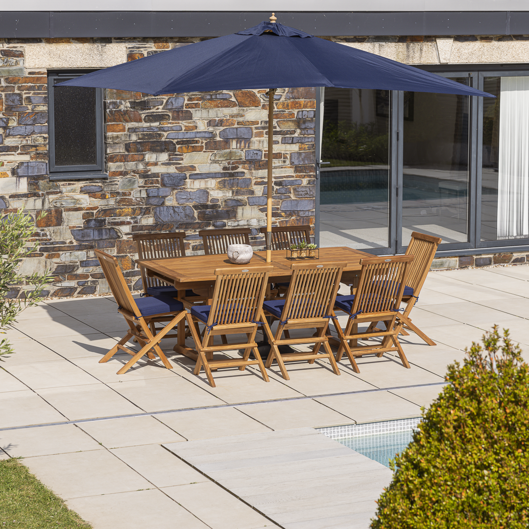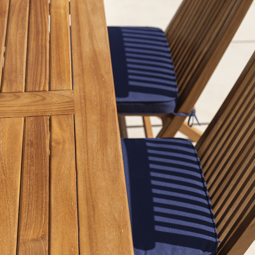 The Lark Dining Set features a 190cm rectangular certified‑teak table with six or eight Cora folding chairs, each supplied with cushions. Crafted from smooth, hand‑finished, low‑maintenance teak, it’s ideal for both home entertaining and commercial spaces. A contemporary, durable set designed for everyday outdoor dining.