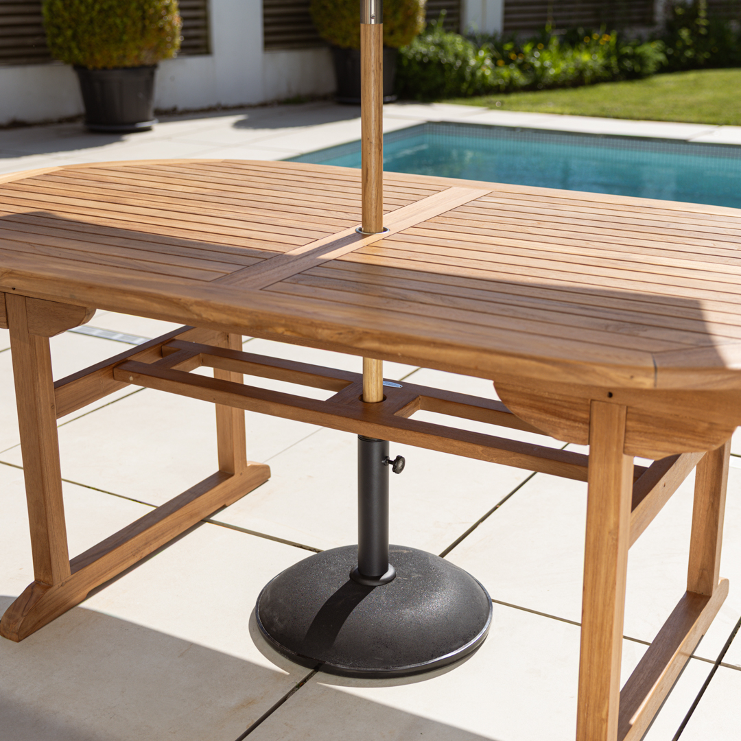 180cm - 240cm Certified Teak Single Extending Cross Leg Outdoor Dining Table with 6 or 8 Natural Kubu Wicker ChairsIn stock