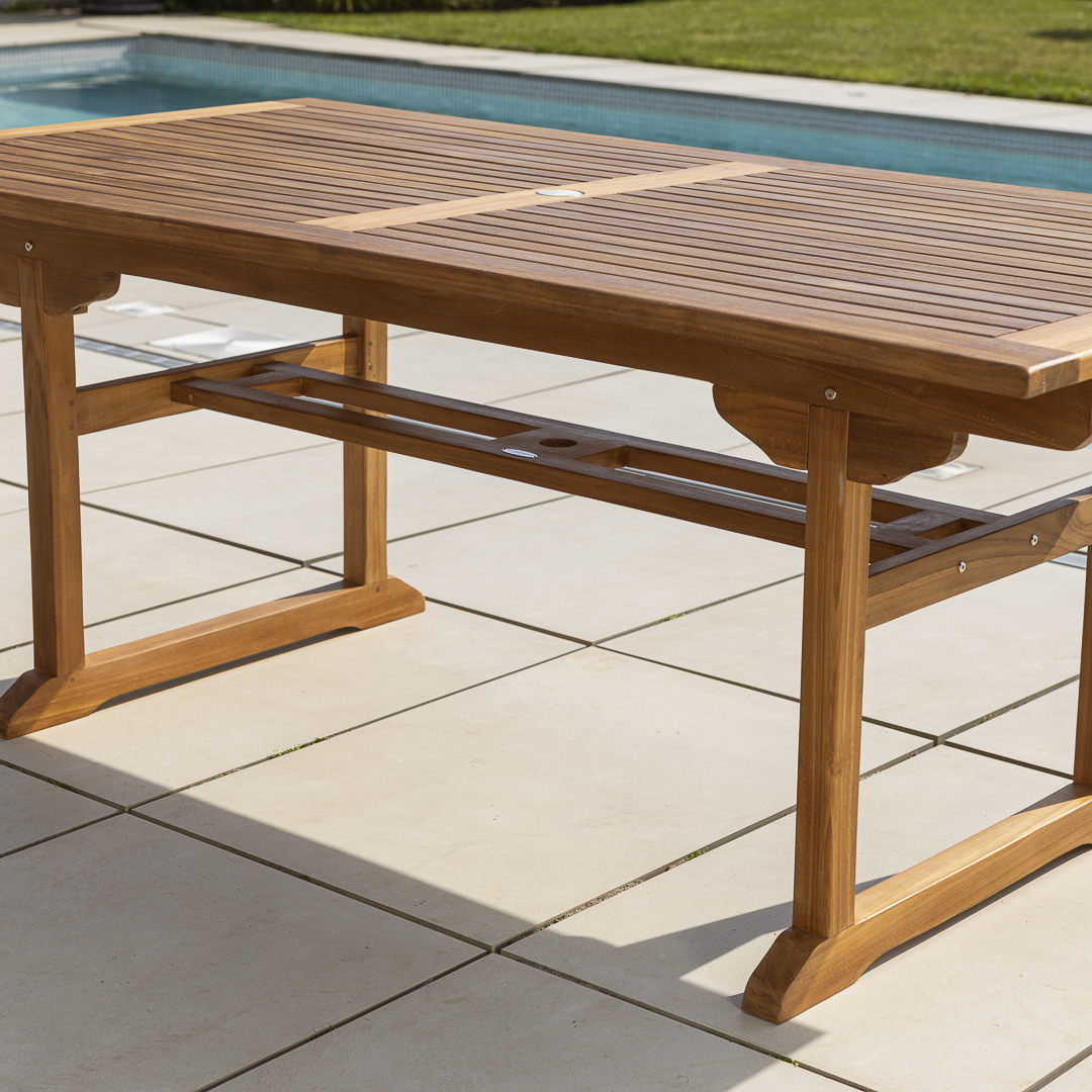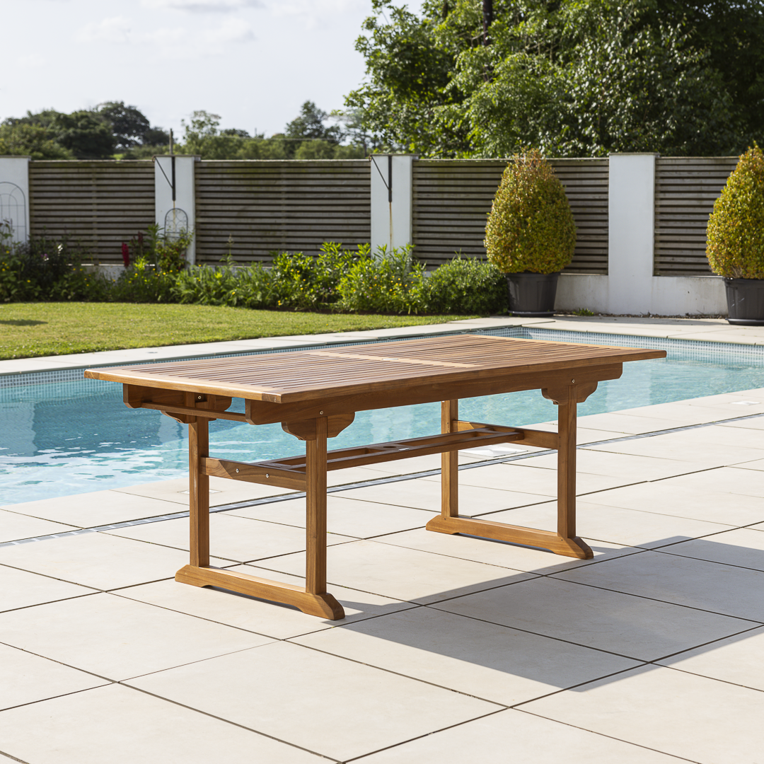 180cm - 240cm Certified Teak Single Extending Cross Leg Outdoor Dining Table with 6 or 8 Marley Teak Stacking ChairsIn stock